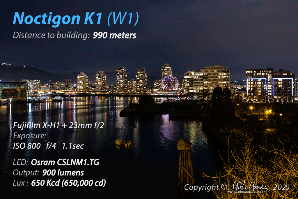 I walked home from work today and took a few impromptu beamshots. I didn’t have a tripod, which made it a bit difficult. There was also a near full-moon and a bit of overcast haze. Following are two animated GIFs showing the same set of images, the first the full image, and the second zoomed in at the pixel level of my 24MP camera. The camera was precariously balanced on a bridge railing (Cambie Street bridge in Vancouver, Canada) and I handheld the light, which might have wavered around a bit during the just over 1-second exposure. The beam spot size on the building and intensity might have been better had the light also been locked down. These shots are fairly representative of what I saw with my reasonably dark adapted eyes, although a wee bit brighter than real life I’d reckon.