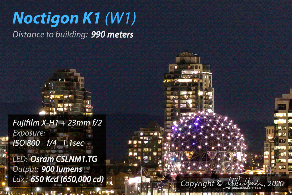 The K1 W1 is rated at 650 kcd and ~900 lm, though I’m guessing the lumens may be slightly lower like 875 or so.