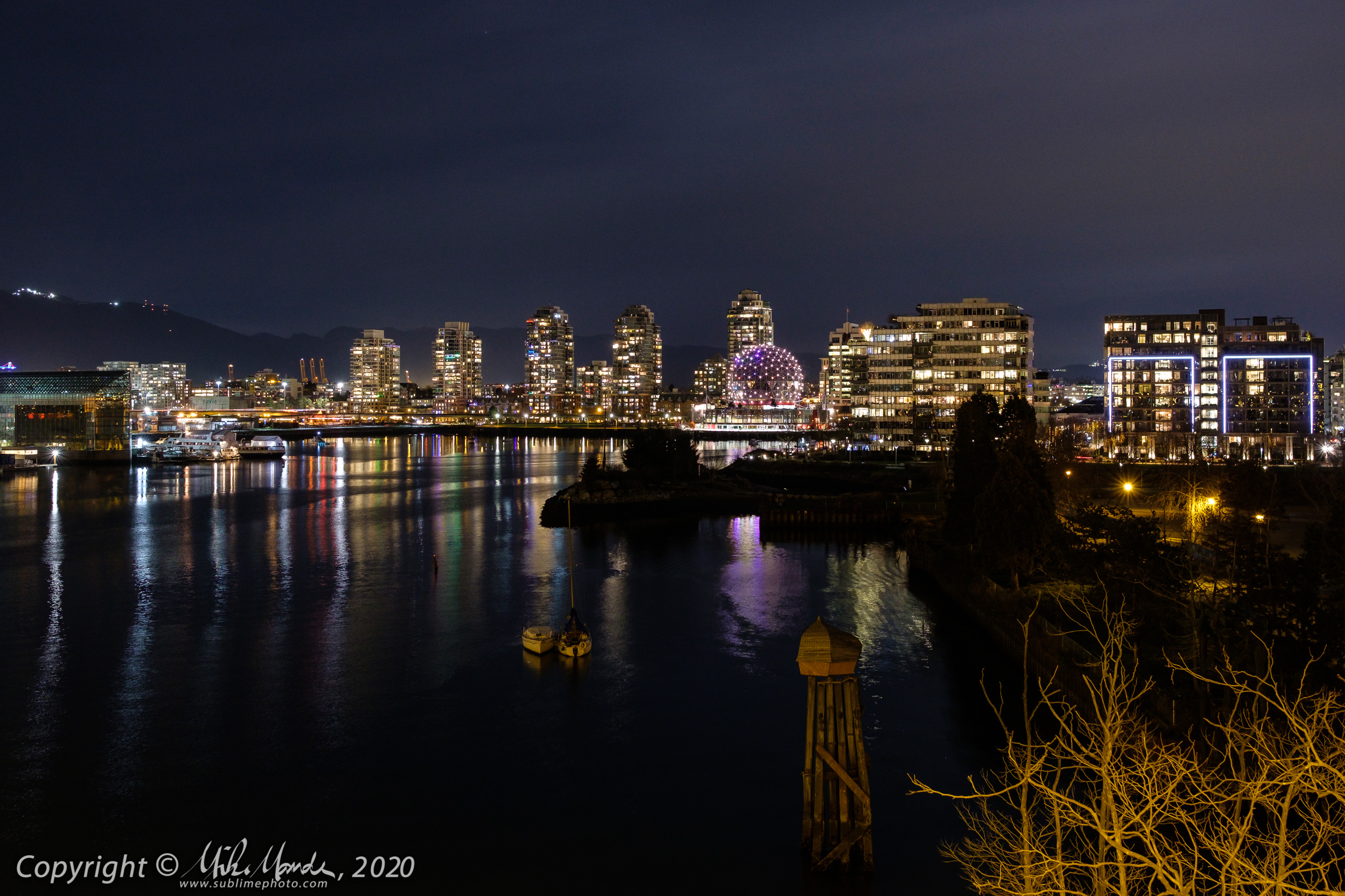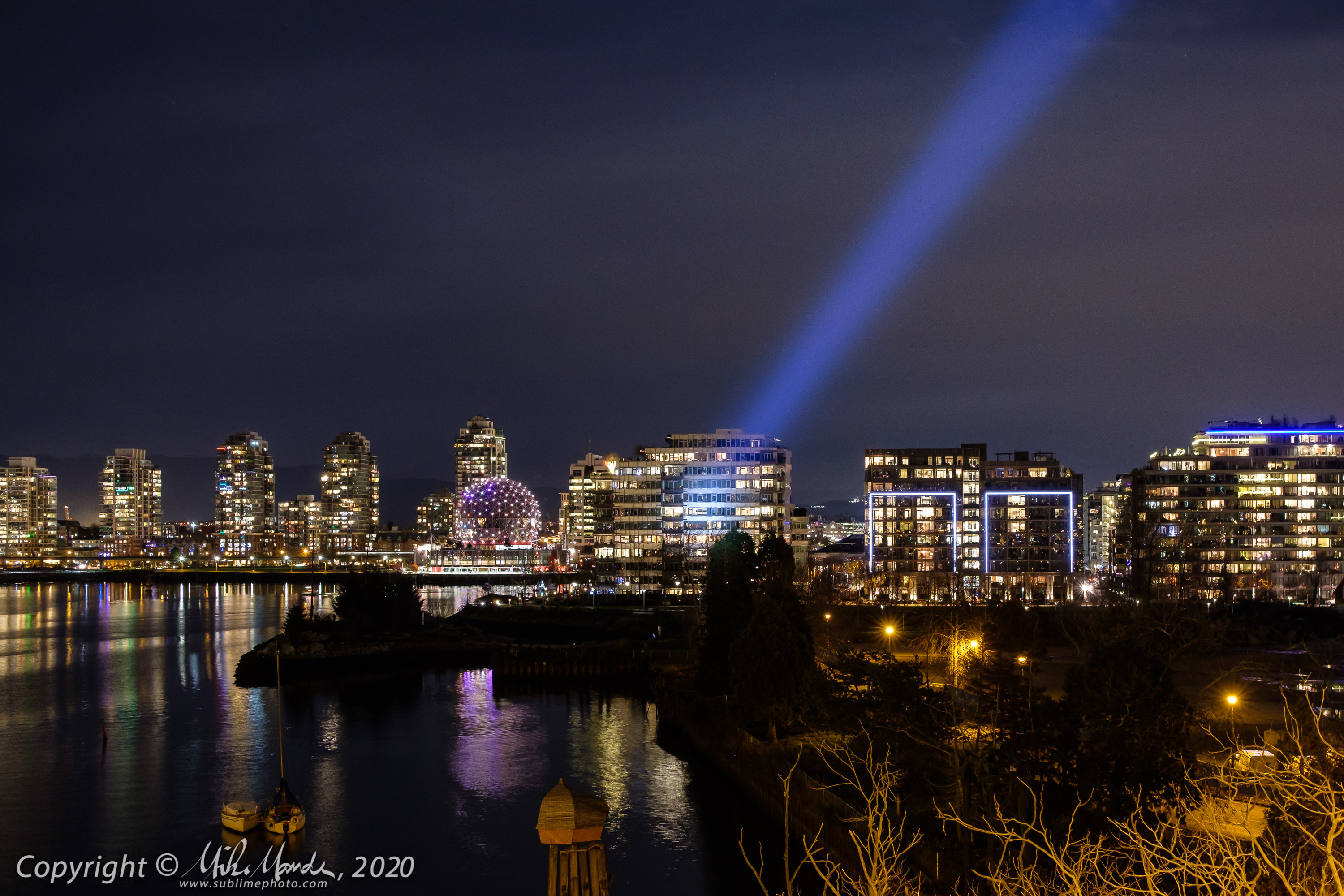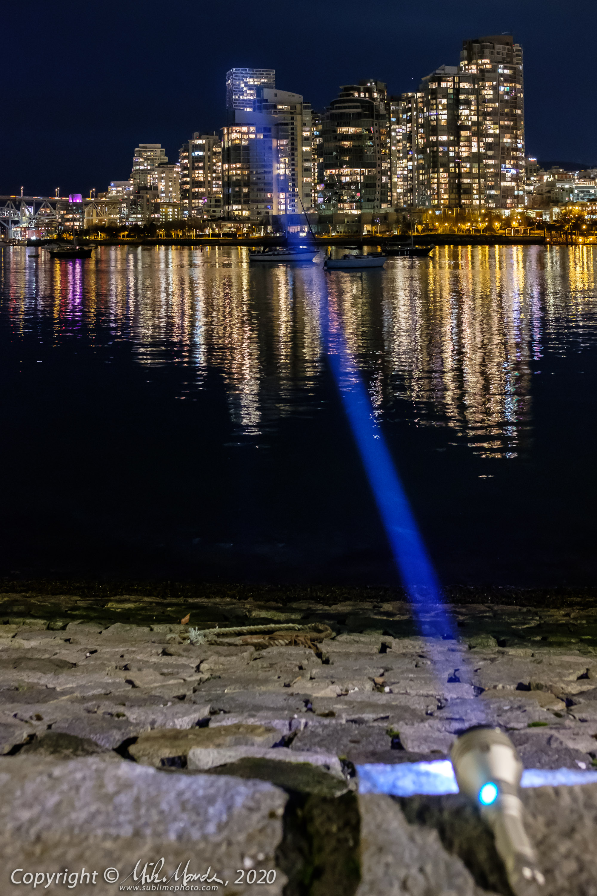 This one is from False Creek, hitting the 160 meter high top of the weird new twisted apartment building. This is 950 meters away according to Google Earth and the exposure is different than the previous ones: handheld (not propped) at ISO 3200, f/3.6 and 1/4 second…