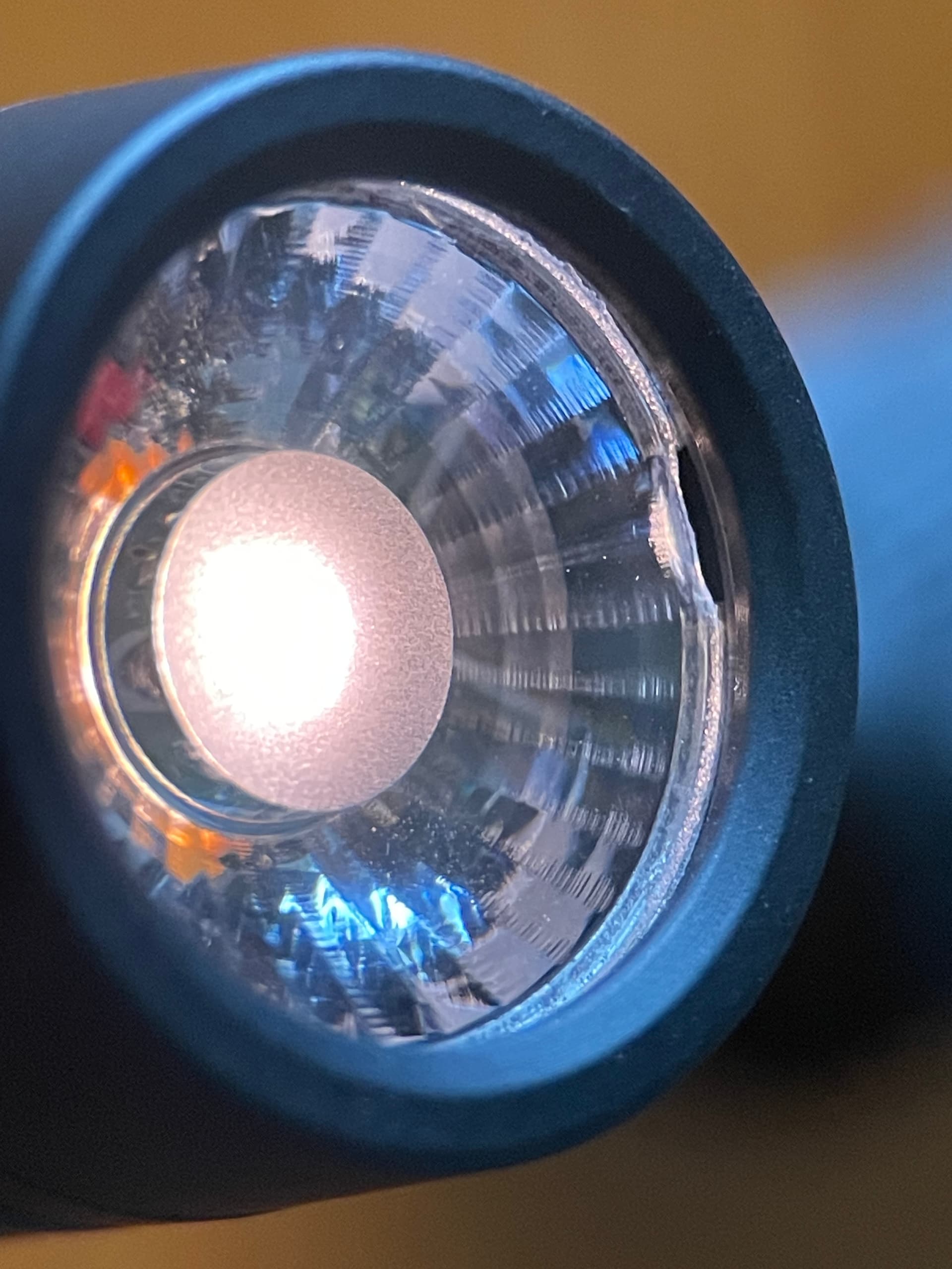 There are two things going on here. There’s a cutout to allow the reflector to be taken out more easily. But mine does have a chipped TIR, as if it had already been repositioned. Plus there was a chip inside the head distorting the beam.