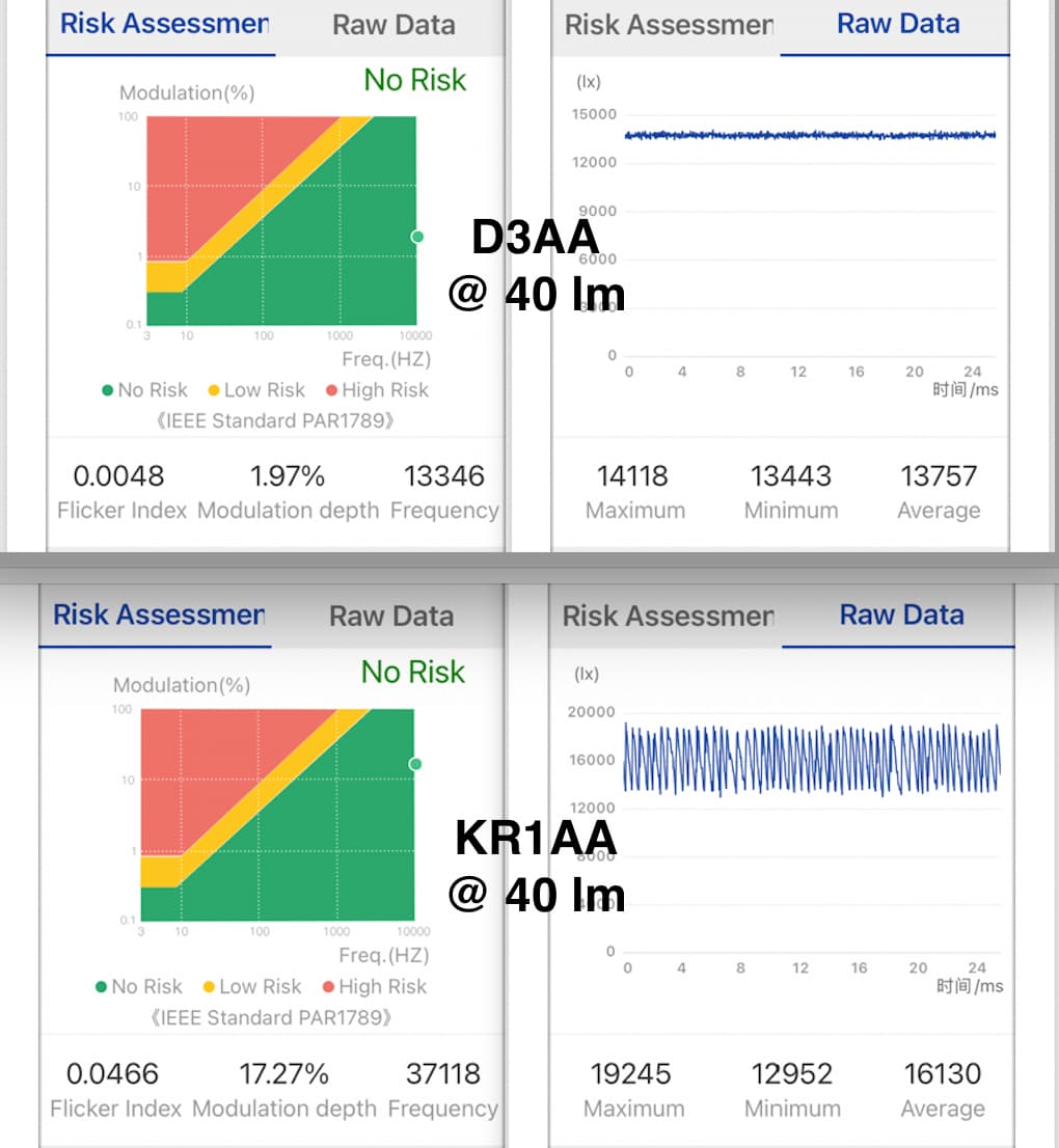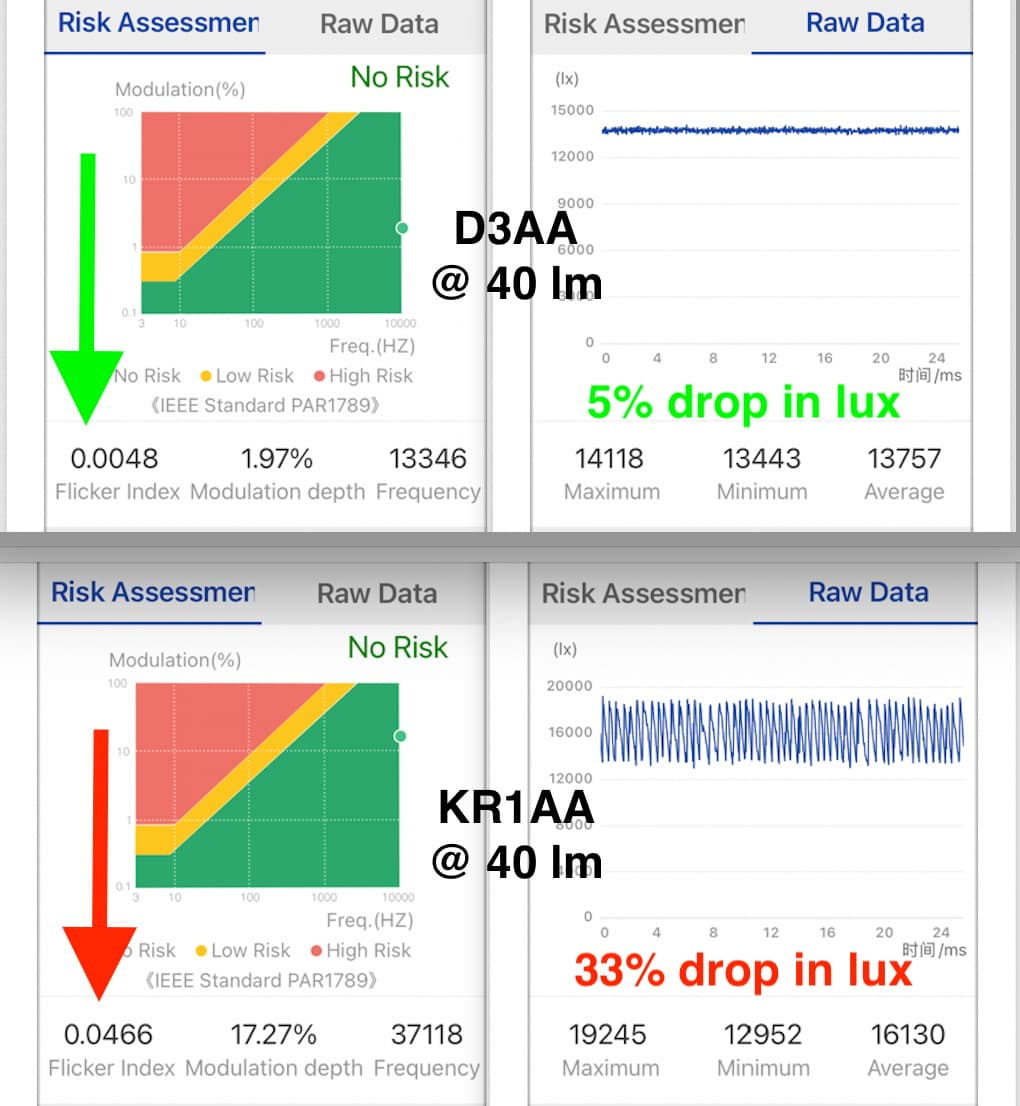 its not visible, but it has noticeable differences in Flicker Index (red and green arrows), and lux oscillations (red and green text min max lux percent change)