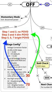 the red 70 is the Option I personally use so that at that level (120 lm) or above, Bright POVD comes on. (ramping step 5, 6, 7 use bright POVD)