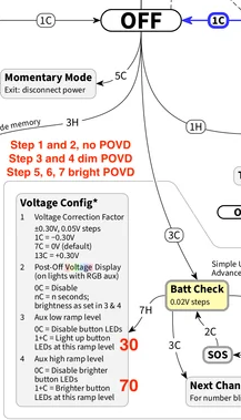 The config options determine the duration and brightness of “POVD”, the Post-Off Voltage Display. That’s when it displays an approximate charge level by color, after turning the main LEDs off and going to “Off” mode. The default is 4 seconds, the color represents a voltage range, and it chooses low or high aux based on what ramp level you were using before you turned off the light.