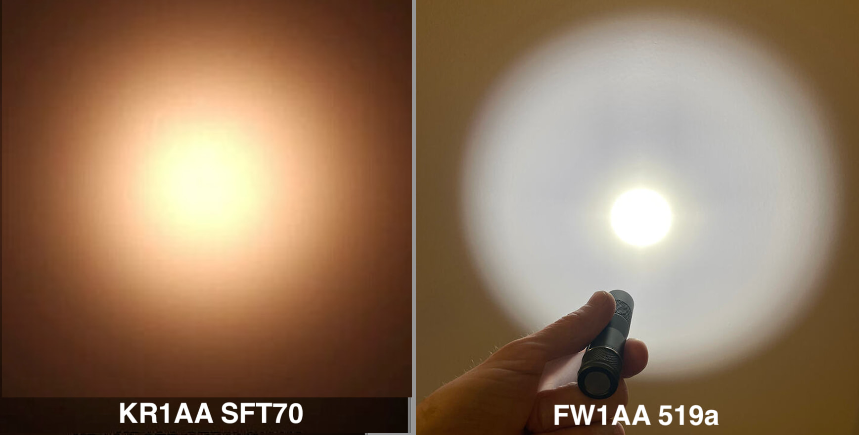 here is a photo of each beam, from separate sources, so not to scale.. maybe you could post an actual side by side beam of your FW1AA and KR1AA side by side from the same distance to a wall to give a more accurate comparison, but here is an approximation: