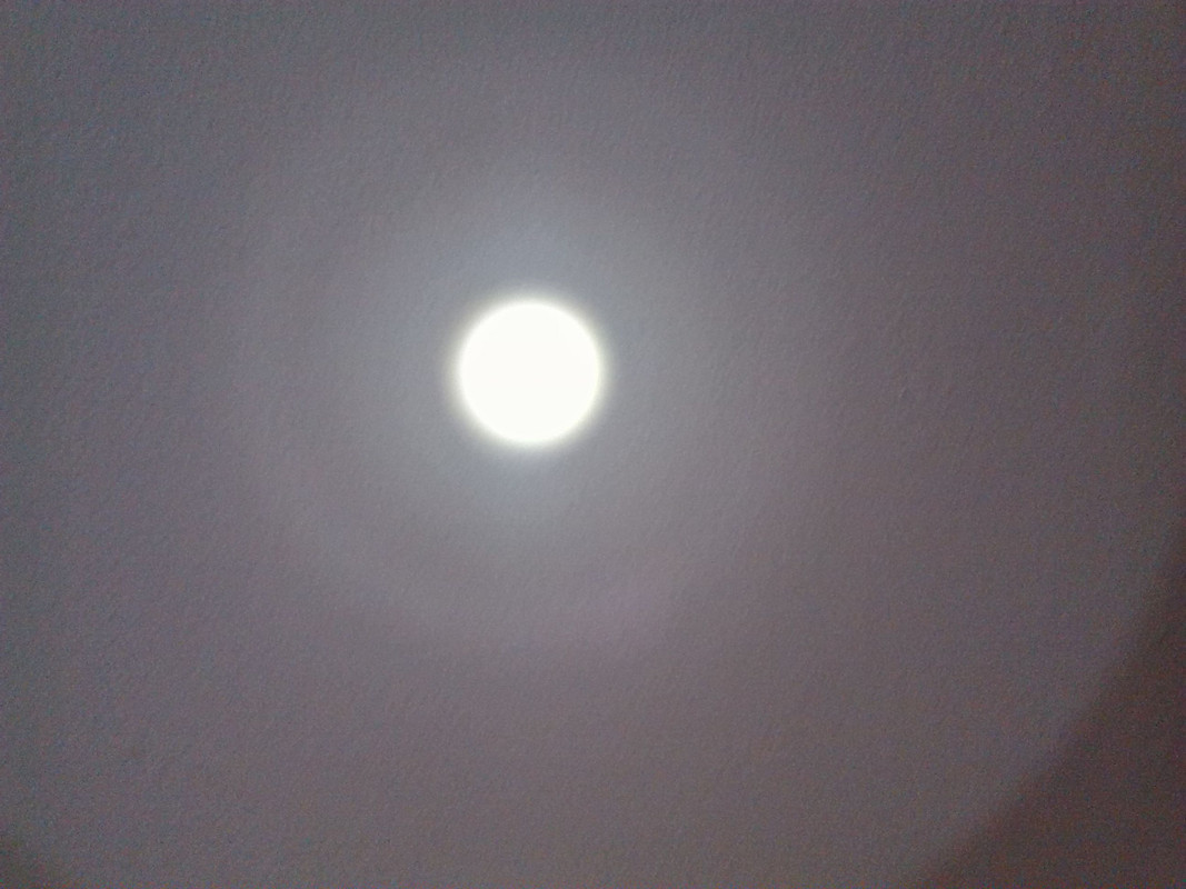 The hot spot is actually much smaller the corona is about half of the diameter, as the camera dose not quite capture it correctly, it’s is clean and tight in real life, and throws like hell for a 35x30mm reflector, You can see the beam as it lights the Stop sign a full city block down with out a problem even with all the street and house lights on in my hood!