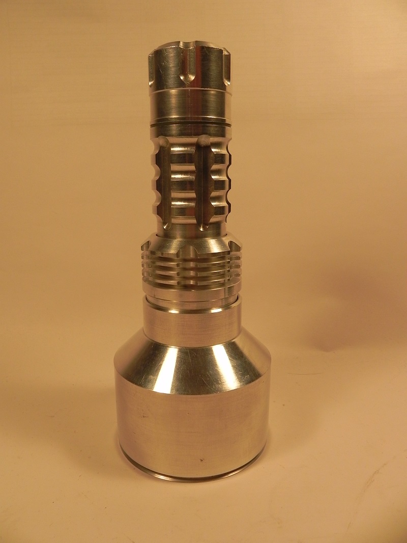I used the new Nichia 219C, perhaps not the most efficient LED choice because of the extremely low vF and even with a low drain cell I can imagine it losing a couple watts in the driver. But I like the brightness produced in medium which draws exactly 1A (my high is set at 5A). I had a spare reflector and centering ring from a defective BLF A6 so I used that.