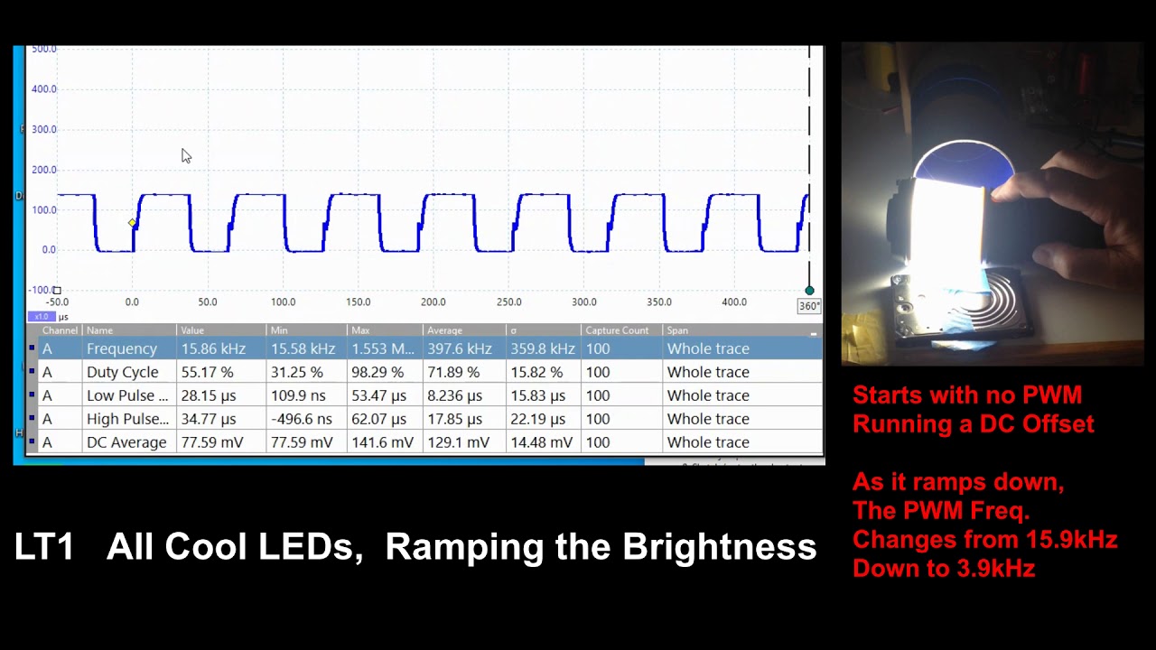 0.46: All cool LEDs only, Ramping the Brightness. Notice the light at full brightness has no PWM. It’s running a DC Offset. As the brightness decreases, the Duty Cycle lowers. The Frequency stays at 15.9kHz. At the lowest brightness, the PWM again drops to 3.9kHz.