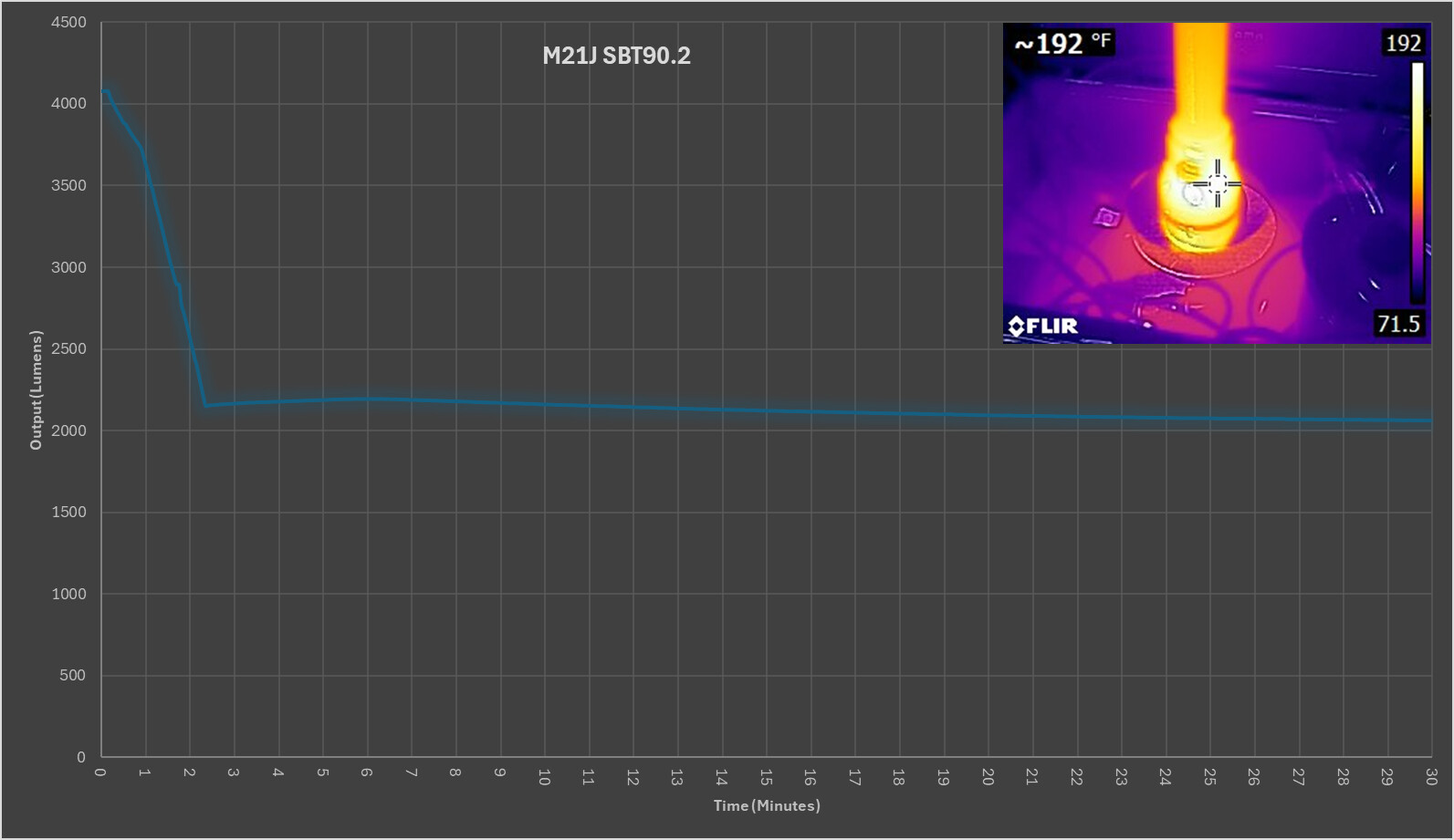 As we can see, the Convoy M21J pushes almost 4000 lumen OTF at startup while puling 9.78A from the cells connected in series.