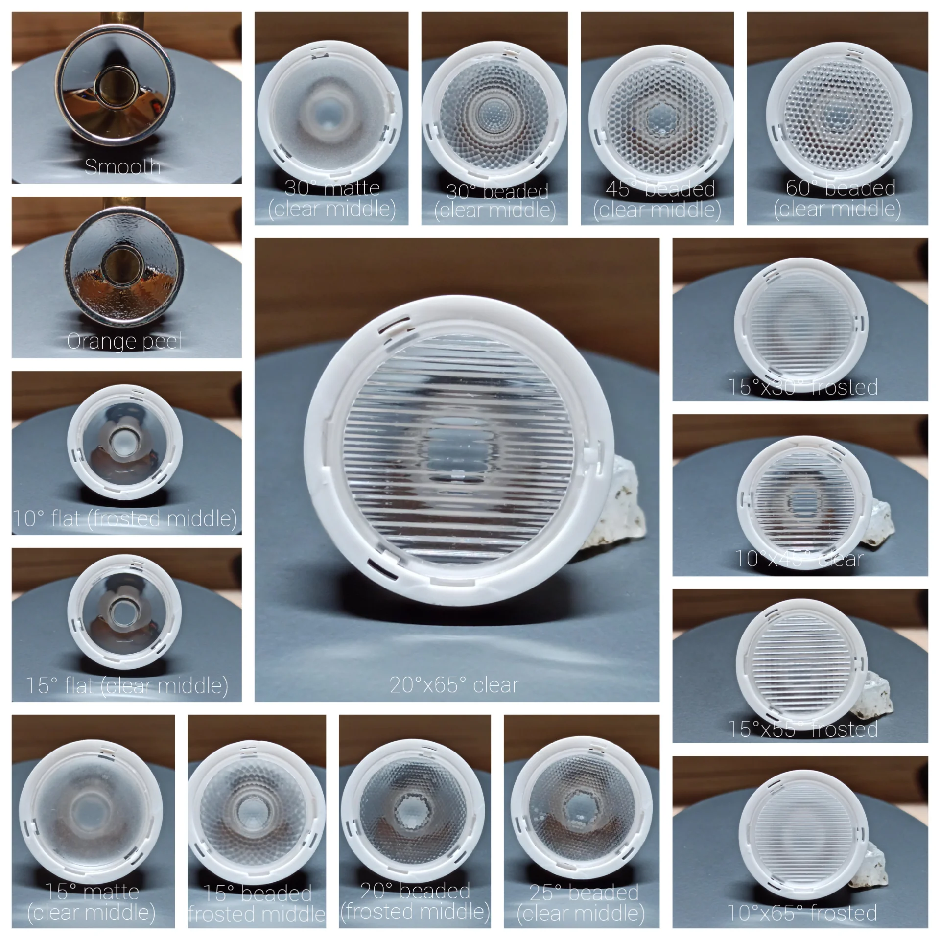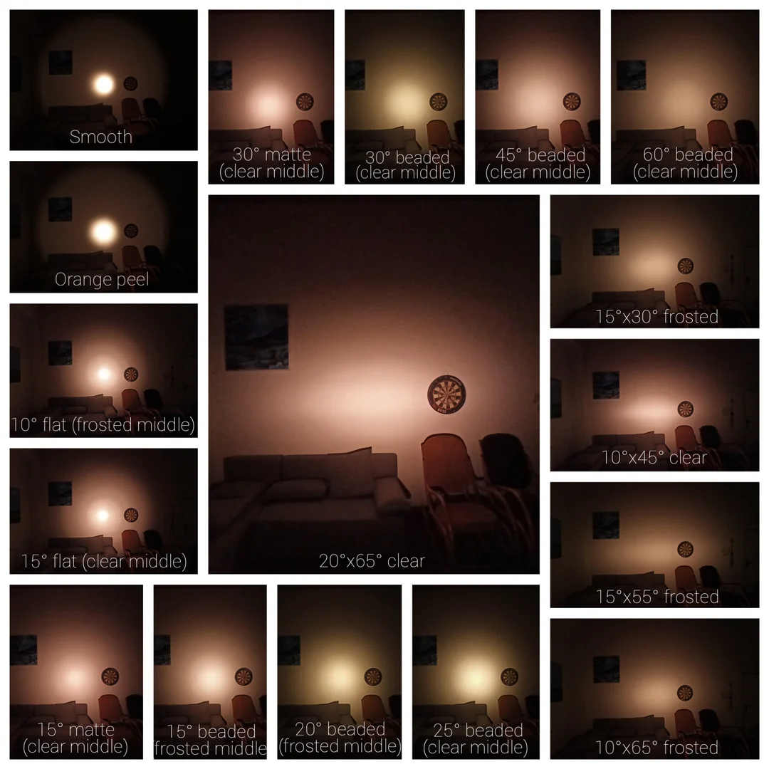 My personal recommendations are 15deg bead for throw, 30deg bead for throw/flood balance, and whatever wide angle bead for flood. I find that the 10deg flat has focus issues, and doesn’t throw visibly more than the 15deg bead. The 30deg bead has incredibly good angular tint uniformity, makes the beam rosier than most TIRs, and doesn’t make a hexagon beam due to the irregular bead pattern.