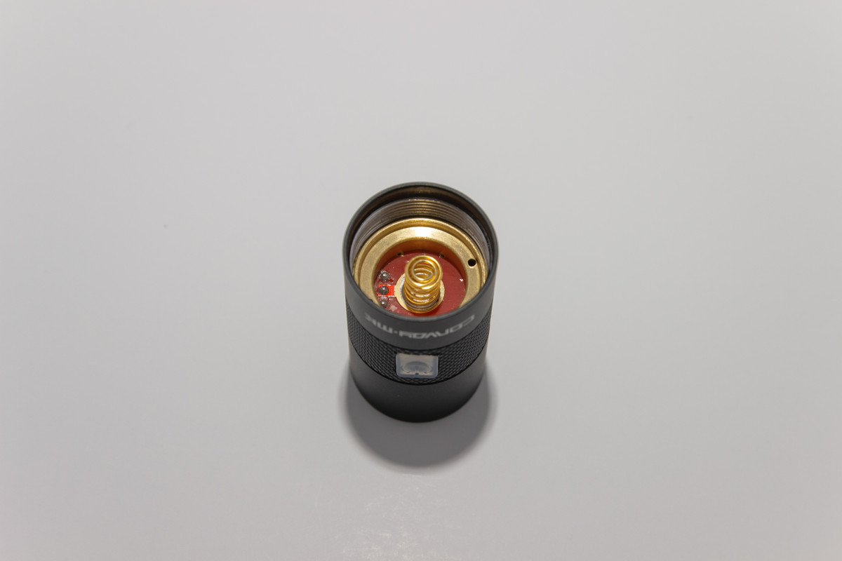 The silver fronts of the 18650 and 18350 tubes both have triangular-cut threads, which do not feel as sturdy as the square-cut threads on the back of both tubes. Also, it is possible to screw the battery tube in the wrong way (this can be seen in the photo with the 18650 tube), although due to the difference in length the light will not function if the battery tube is screwed in improperly.