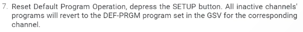 Restoring default programs is simple. Just press and hold the SETUP button, and all channels will revert to their default programs with one action.