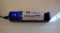 Not much to talk about here - this charger has no buttons, and no real display to speak of. Just pop in a cell and charging will start. The three blue indicating LEDs will indicate charge state - starting with 1 flashing, then 1 solid with the second flashing, until all 3 stop flashing indicating the charge is complete.