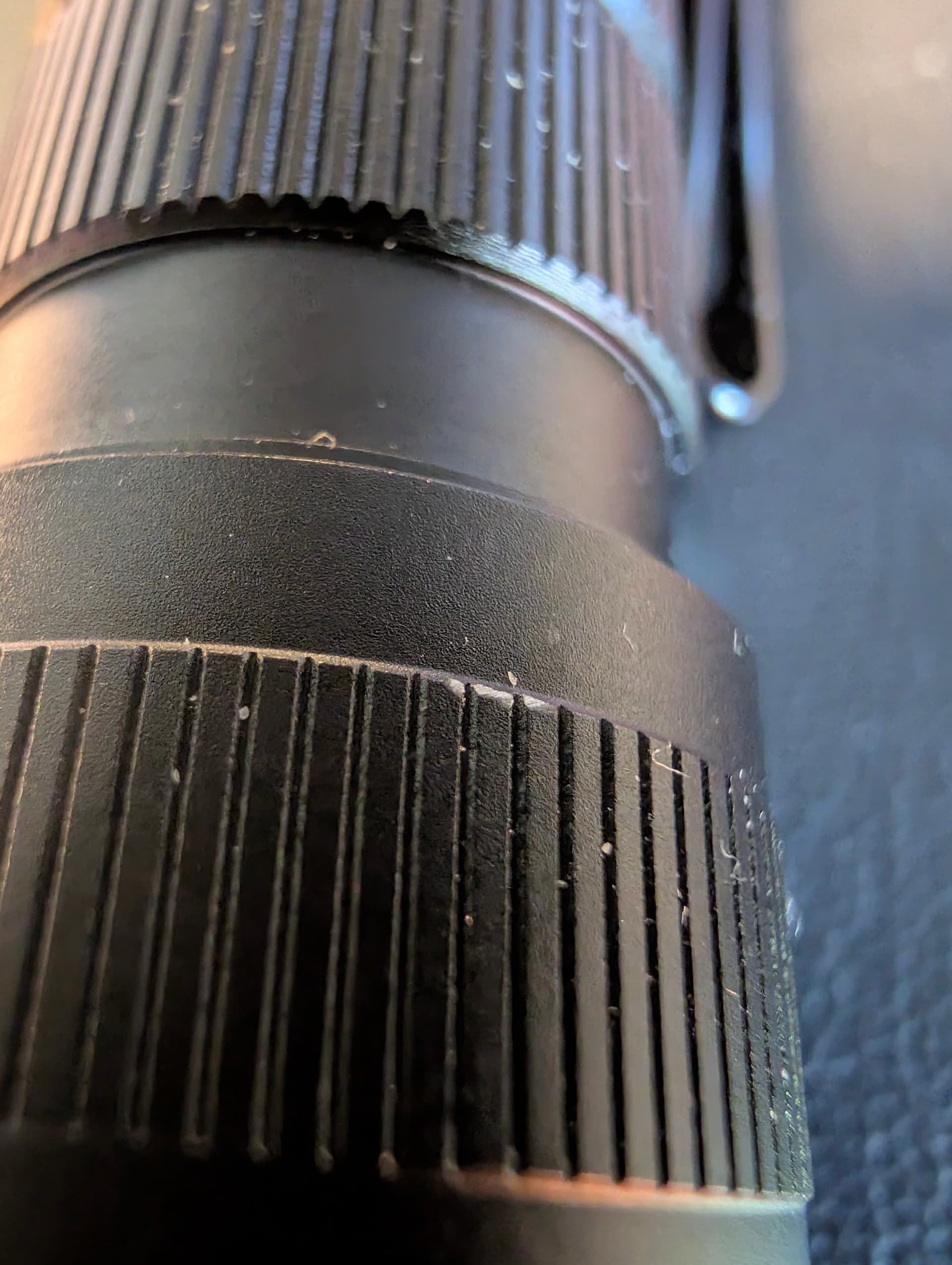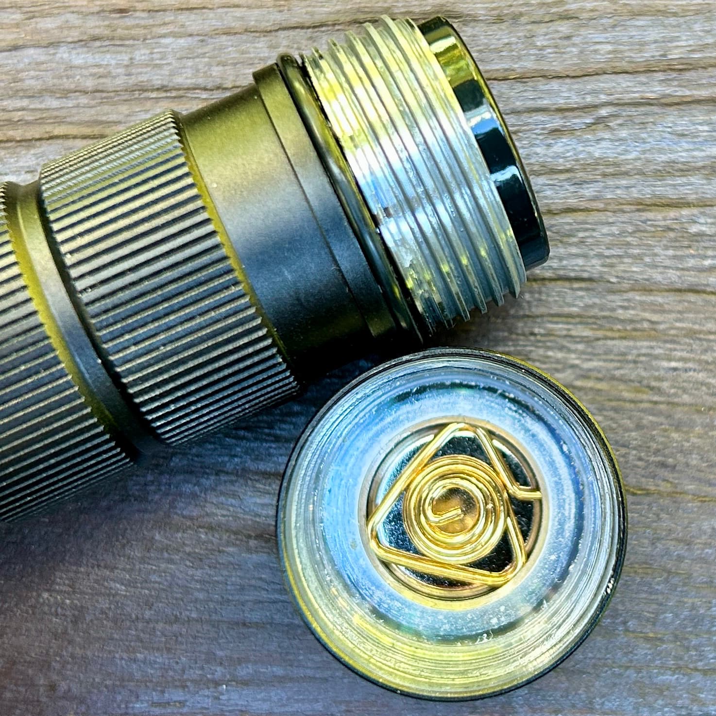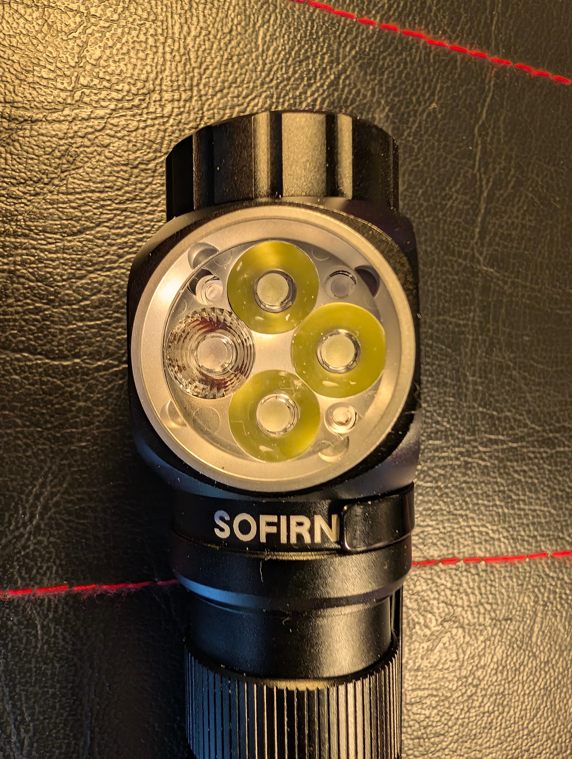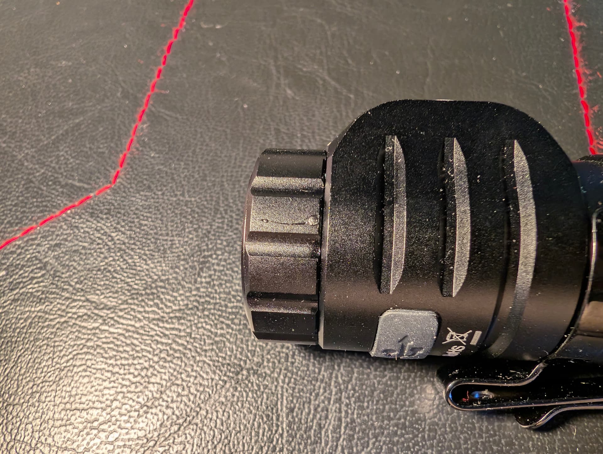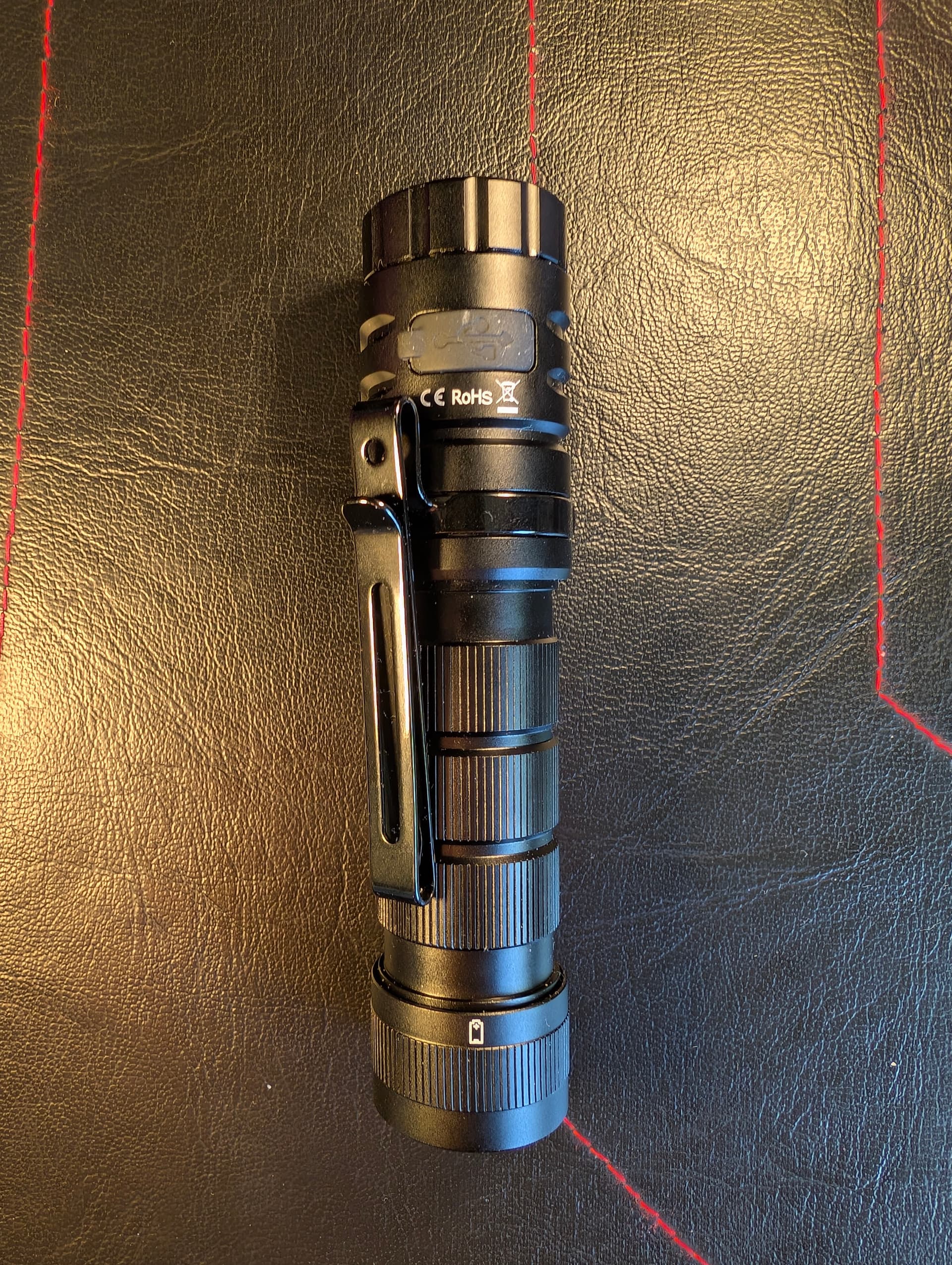 There are no switches on the light, just a ring with 5 distinct positions. It turns with a subtle click, each position is easy to find. It switches slightly before clicking into position (not problematic, but interesting). In the middle of the ring sits a battery indicator (Sofirn doesn’t specify %, only green = high, orange = medium, red = low and red blinking = very low).