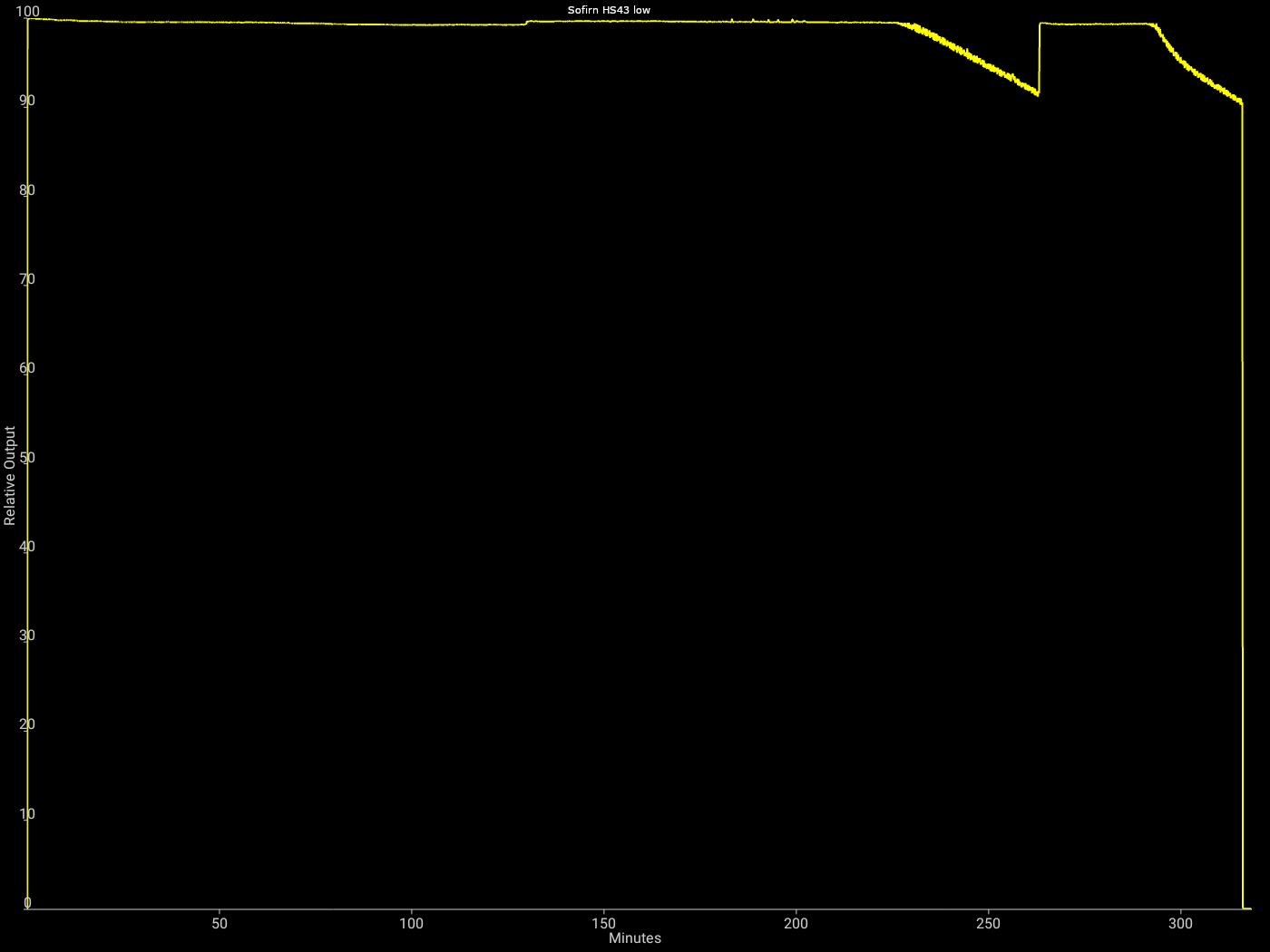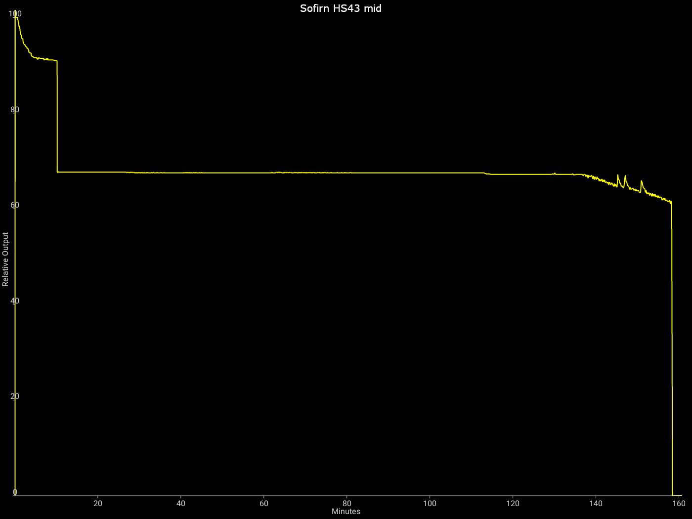 Low is regulated flat as well but has one slow drop of about 10% (slowly, so you won’t notice) and suddenly ramps back up. You will notice the step up. I can’t explain that behaviour, never seen this on a light, especially as it runs for an more than half an hour perfectly fine on the regulated level.