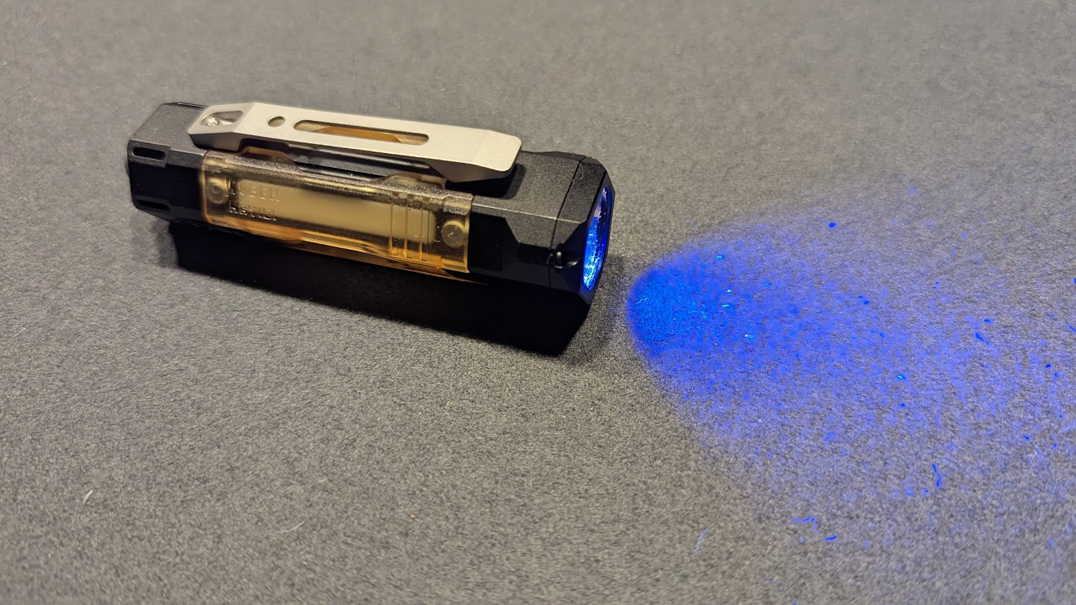 Four more taps switches you to the UV light. This is a single emitter on the front of the light, next to the primary LED’s. It utilizes the same reflector as the primaries. It’s a 2 watt, 365nm UV LED. The reflector helps focus the beam a little, and really seems to help quite a bit. I don’t think it’s powerful enough to go scorpion hunting with. But, it’ll definitely help around the house.