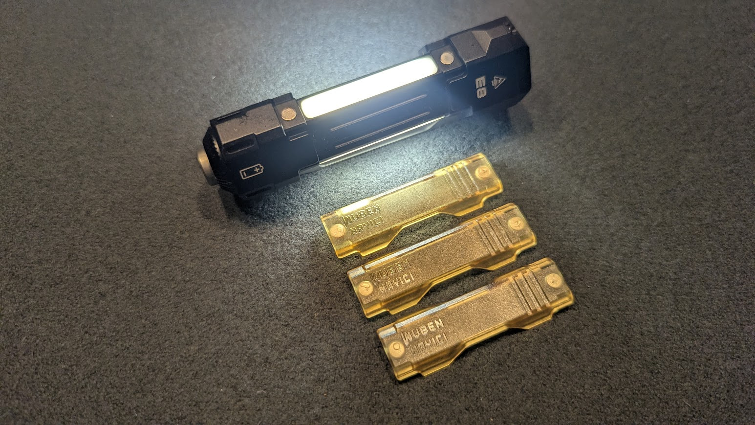 Four taps (not full clicks) of the button will switch to the side COB lghts. There are 3 lights, total. My Opple reads them as 4000k and around 80 CRI. They have 3 modes; low, high and beacon flash. The E8 comes with amber panels that can fit over the lights. However, there are also red panels, white panels and blue panels that can purchased separately. The panels are held on by magnets and easily pop off the sides. However, I’ve not had even one problem of them accidentally coming off. They sit flush with the sides of the light and have a small indention near the middle for removing them.