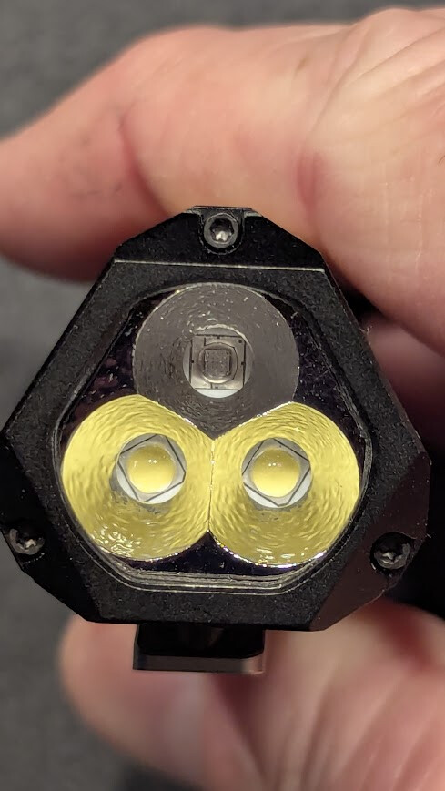 They’re 2xSST-36F. They have a nice, neutral, 5000k tint at 100%. Below that, the lower you go, the more green it gets. But, even at the lowest, it’s still tolerable (and I’m kind of a tint snob). There are 3 settings for the primary LED’s; Low, Medium, High. There is no moonlight. And low is still bright enough that it hurts to look into it. My Opple read these LED’s at only 70 CRI. Trading CRI for lumens, this little guy cranks out 1300 lumens. It’s a very floody light. It has no problem lighting up my entire yard.