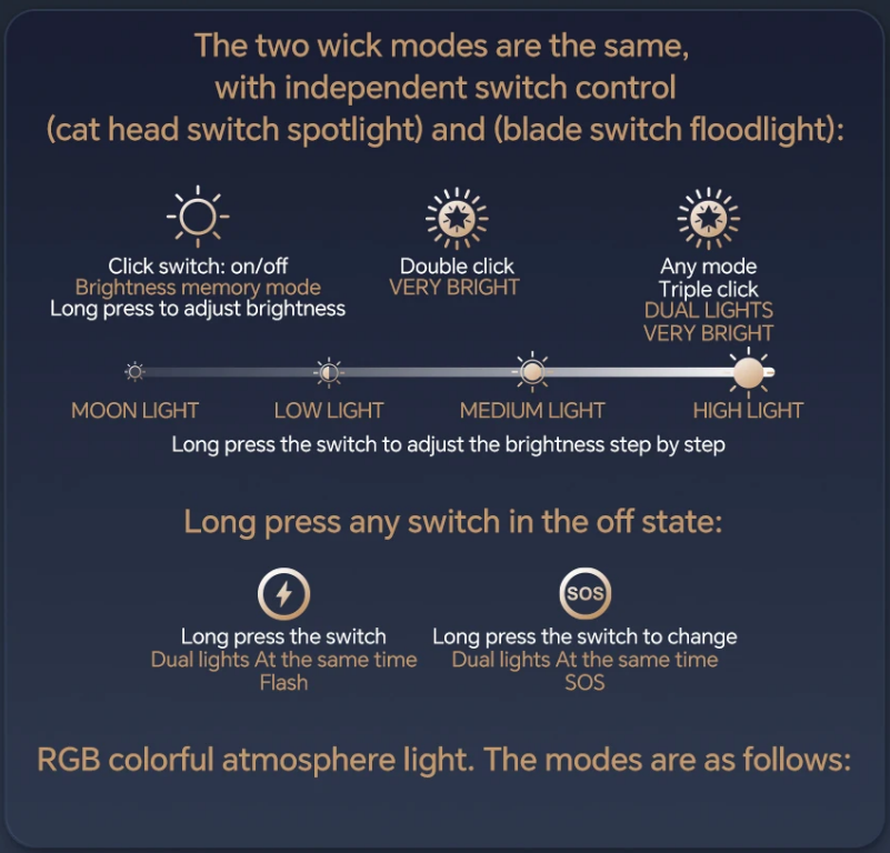 Doubleclick from off for police lights (red/blue), single click for on/off. Doubleclick from on to change the mode, hold to change the color.
