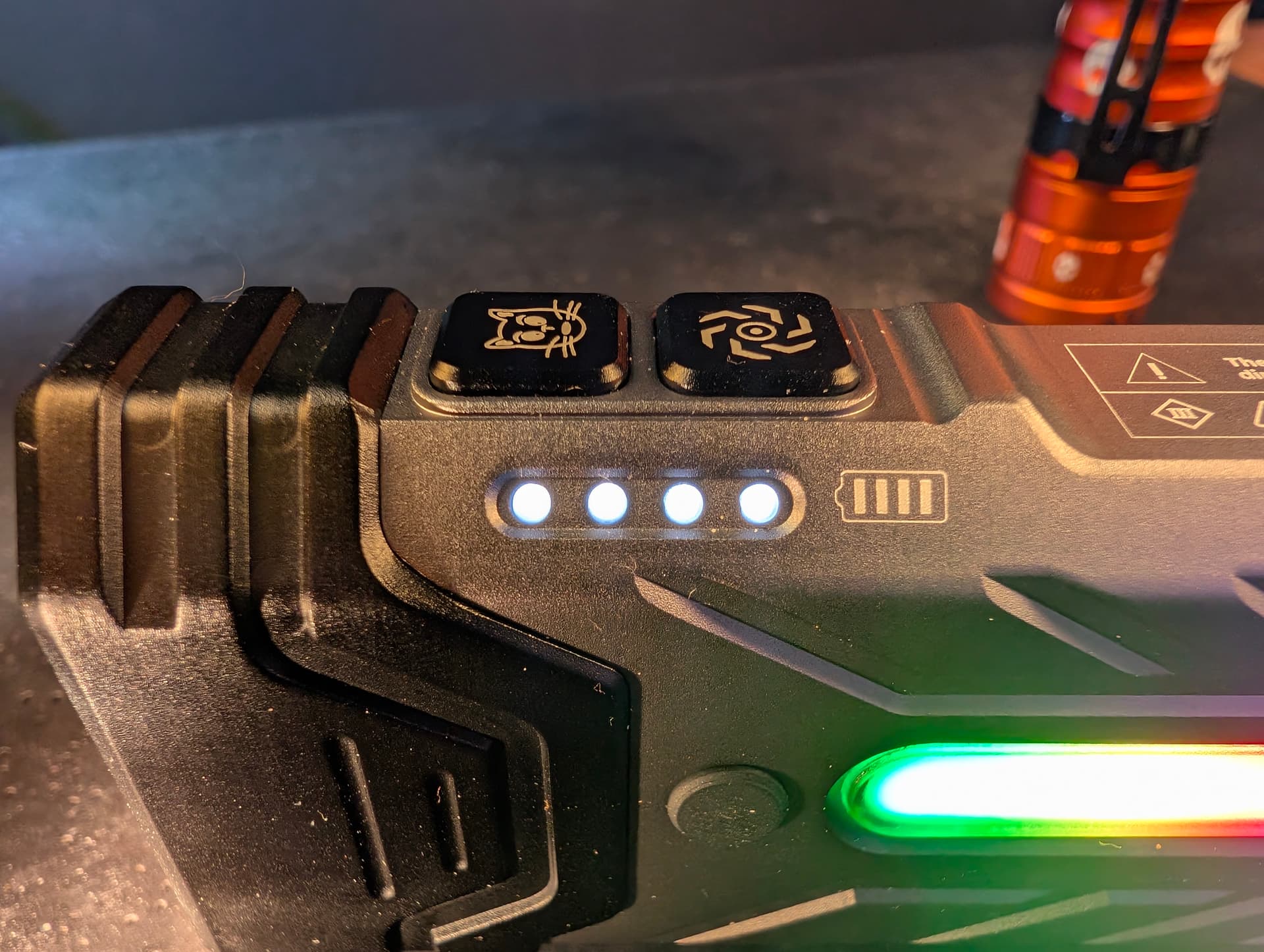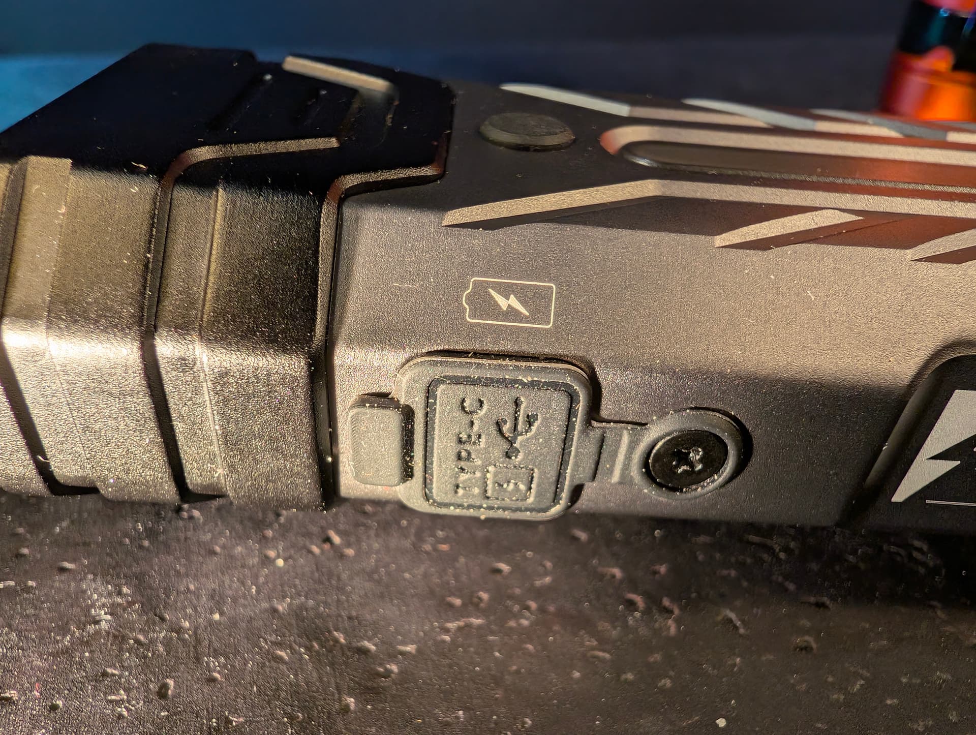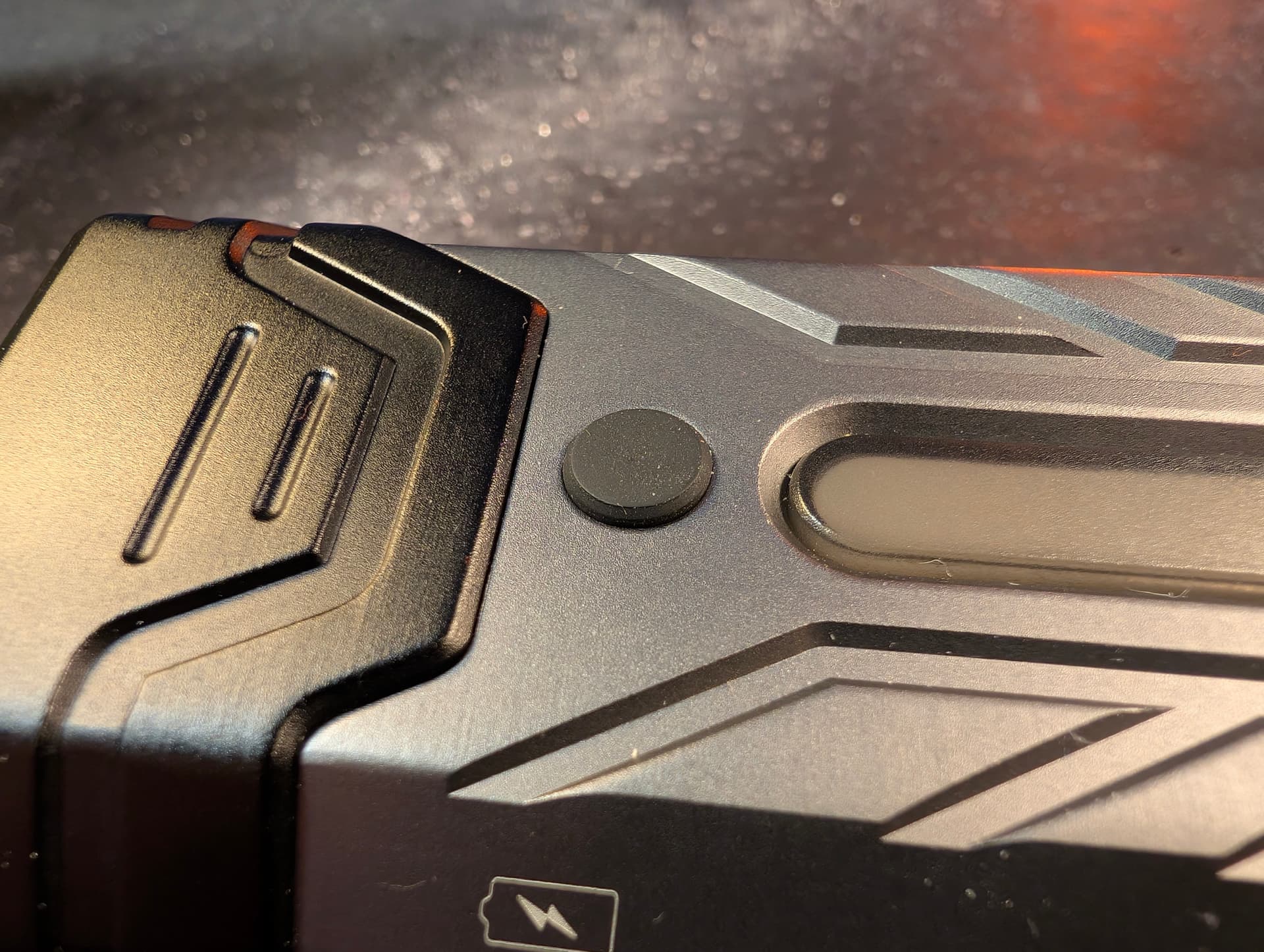 The side switches feel amazing at first, they are metal covered. The one for the spot LED has a cute cat face on it, the flood one a sawblade. The switch for the sidelight is a small, round rubber button.