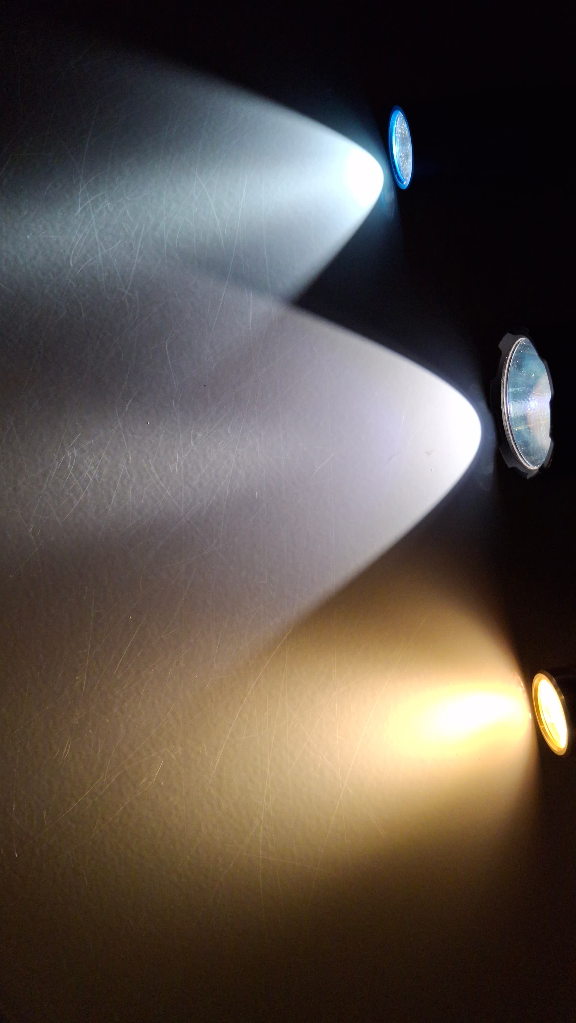 Here is a pretty accurate tint comparison, except the top FL5009R is not that green. This phone really gives me a hard time comparing tint on three or more LEDs, it always makes one look rosy or more green. Top is FL5009R 5000K (extremely neutral just like 5000K FL351A), middle of FL707MD 4000K, bottom is XPL-HI 3000K gen1, not sure of bin, but they’re actually a tiny bit rosy. CRI on the FL707MD seems to be pretty good, but it doesn’t look like it has 90+ R9. Reds look better with SFT-40/70 3000K, or any R9080 Nichia 219B or 519A.