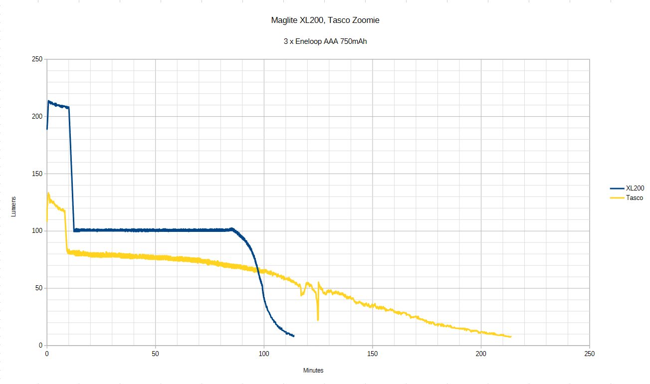I have these lights so I may as well test them. The reason I say these were a pain to test is that both ramp up the output for like 30-60 seconds and then start falling off. I use the ceilingbounce app to record runtime, and I turn the light on in a Texas Ace lumen tube before the test so I can scale the recorded output. But when a light quickly changes output this becomes more difficult. Testing a light on turbo that drops off, usually just pulling one data point later after it stabilized is enough to feel confident in the graph scaling. I often do this near the end because just moving the light can change the ceilingbounce reading a bit. But a light that is always increasing or decreasing, it’s tougher. So the Tasco run likely has a wider margin of error than other tests I do. If the light was interesting enough to bother, basically doing two timed runs where I spot check several times with one run, and one where it isn’t moved would give more confidence. I sometimes do this with other lights, I might only record 20-30 minutes and I’ll spot check where the output had flattened out.
