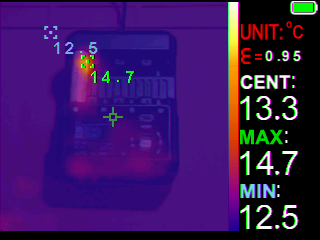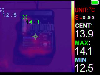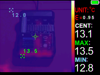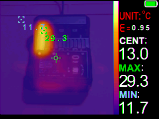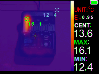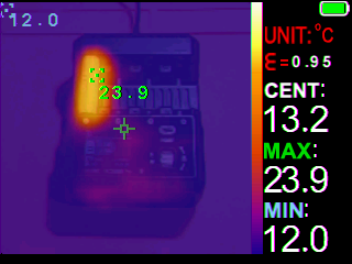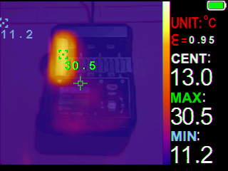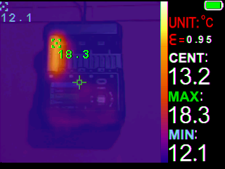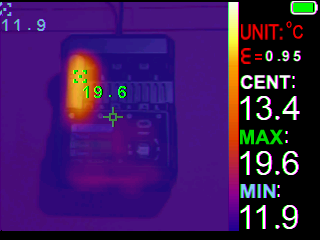 I used a Zoyi ZT-R01 IR Thermography Multimeter to take thermal images of the SkyRC NC3000 Pro while using Turbo mode to charge a LADDA AA NiMH 2450mAh cell at a rate of 3A.