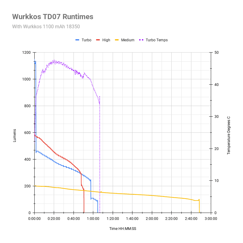 otoh, in this chart you can see that Turbo and High (Red and Blue lines) last about an Hour, but notice the output is not steady, it continuously goes lower.. for me, that is not good, and is a reason not to buy it