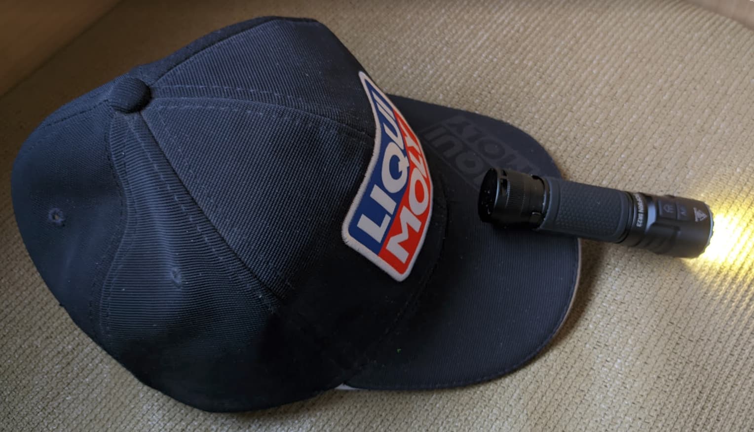 That was doable thanks to its double-direction clip, and I’m glad to say that despite it being 21700-sized, the SR23 was light and compact enough to work well on my freebie/promo (so, not great quality) Liqui Moly hat: wouldn’t try to run or jump around with it, but for walking about and doing stuff it was totally stable: