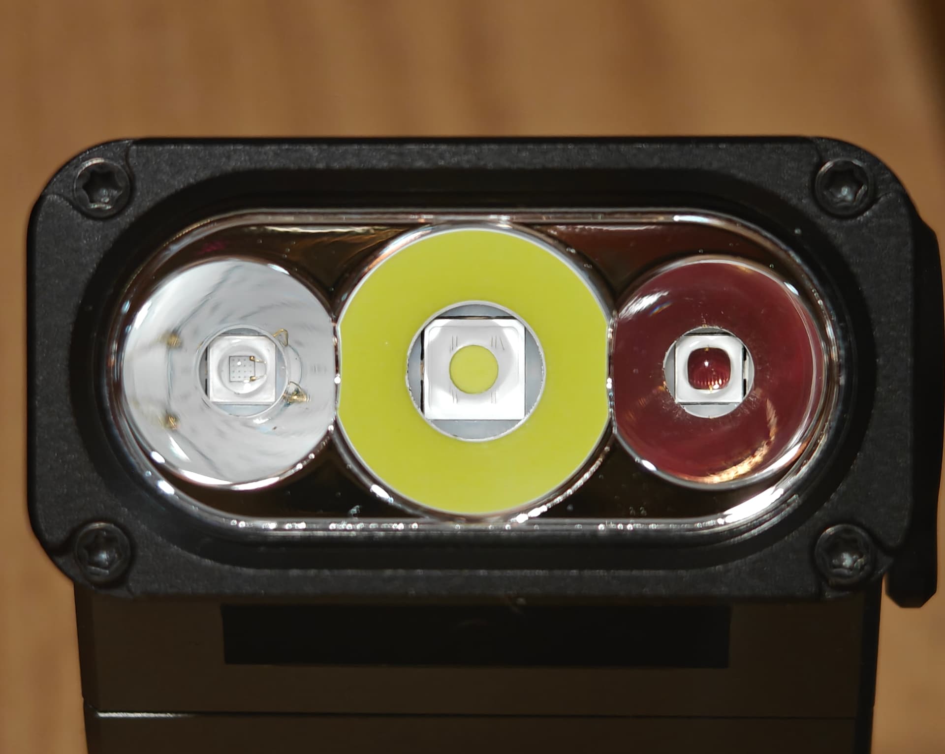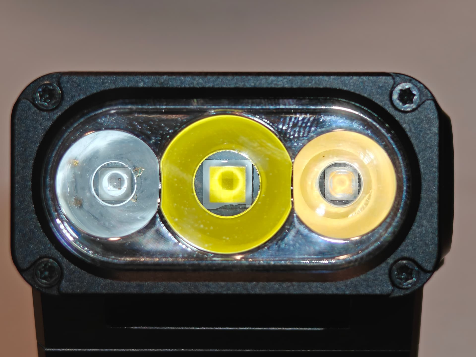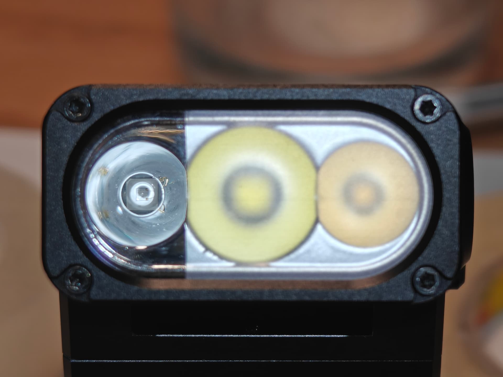 This light has 3 emitters in smooth reflectors behind an AR-coated glass: SFT42R (6500K) for the main light, plus SST20-DR (660nm) and what appears to be SST08-UV-H (365nm). I think this is a fantastic combination: the SFT42R provides simultaneously good throw and flood, the SST20-DR provides very powerful red, while the SST08 UV emitter throws quite well behind the smooth reflector, and with output very impressive for the small LES.