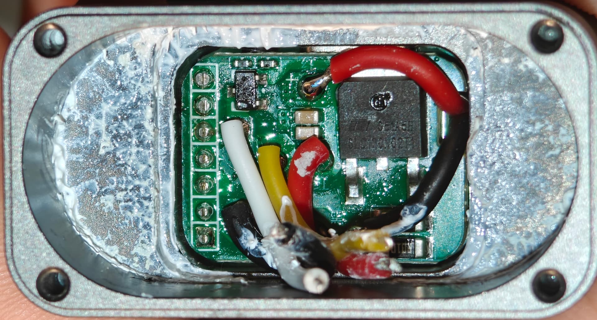 Lifting the block reveals the driver, which has a large square component thermally coupled to the block by a heatsinking pad. I’m guessing that’s a MOSFET, but someone should correct me if wrong.