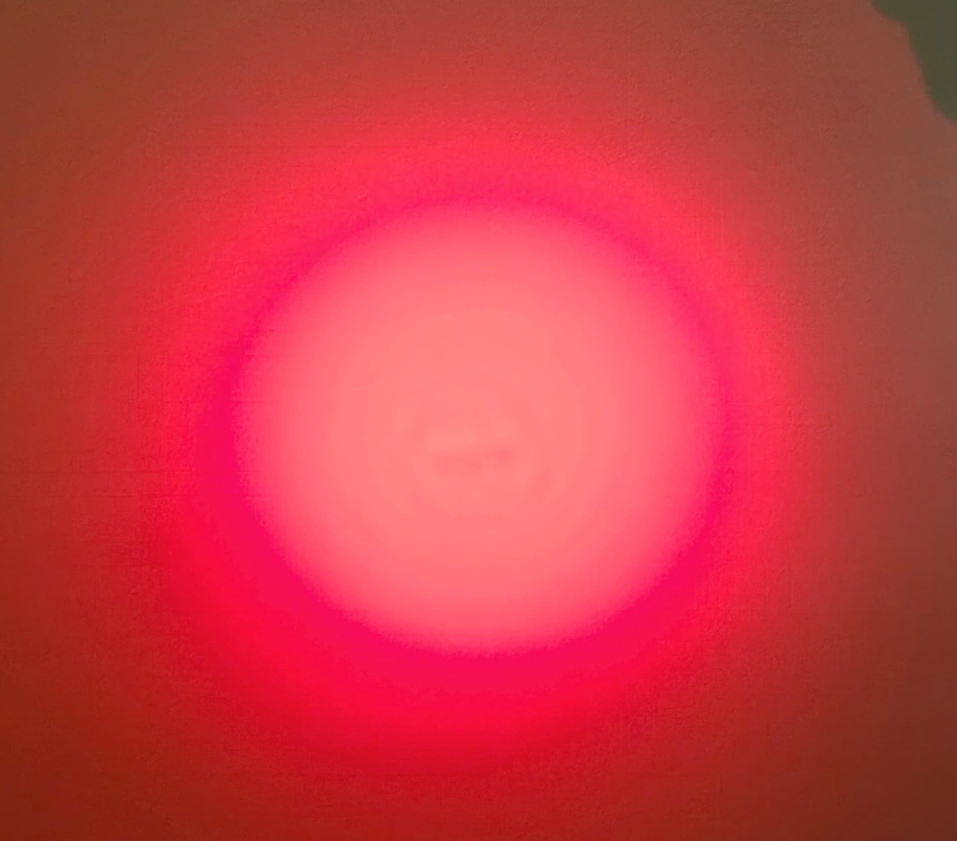 The hotspot appears slightly lopsided due to imperfect centering, but is not a problem in real use. The red hotspot exhibits some swirl patterns due to the striped construction of the SST20-DR’s die; for this, I would suggest changing the reflector from smooth to OP.