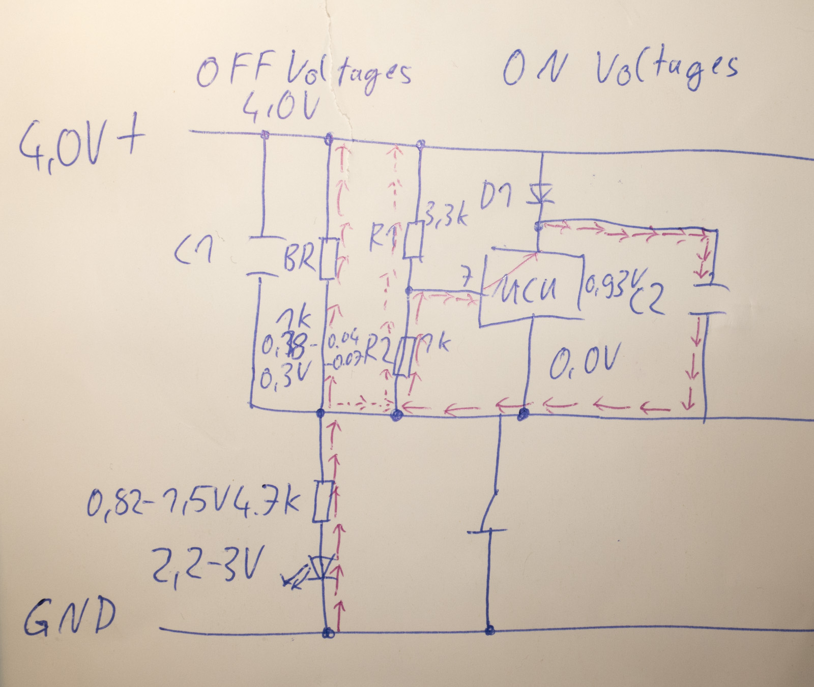 Ok, nice red arrows but your mcu current path is wrong. Pin 7 has mega-ohms of resistance. The electrons flow back to the mcu through the mcu's own case conection, not through pin 7. The C2-mcu circuit is completely isolated and just floats on the case ground. It has nothing to do with anything. You can just remove it from the picture. You can also remove C1 as it has no affect in DC when the led is powered.