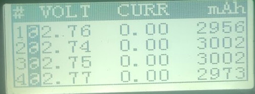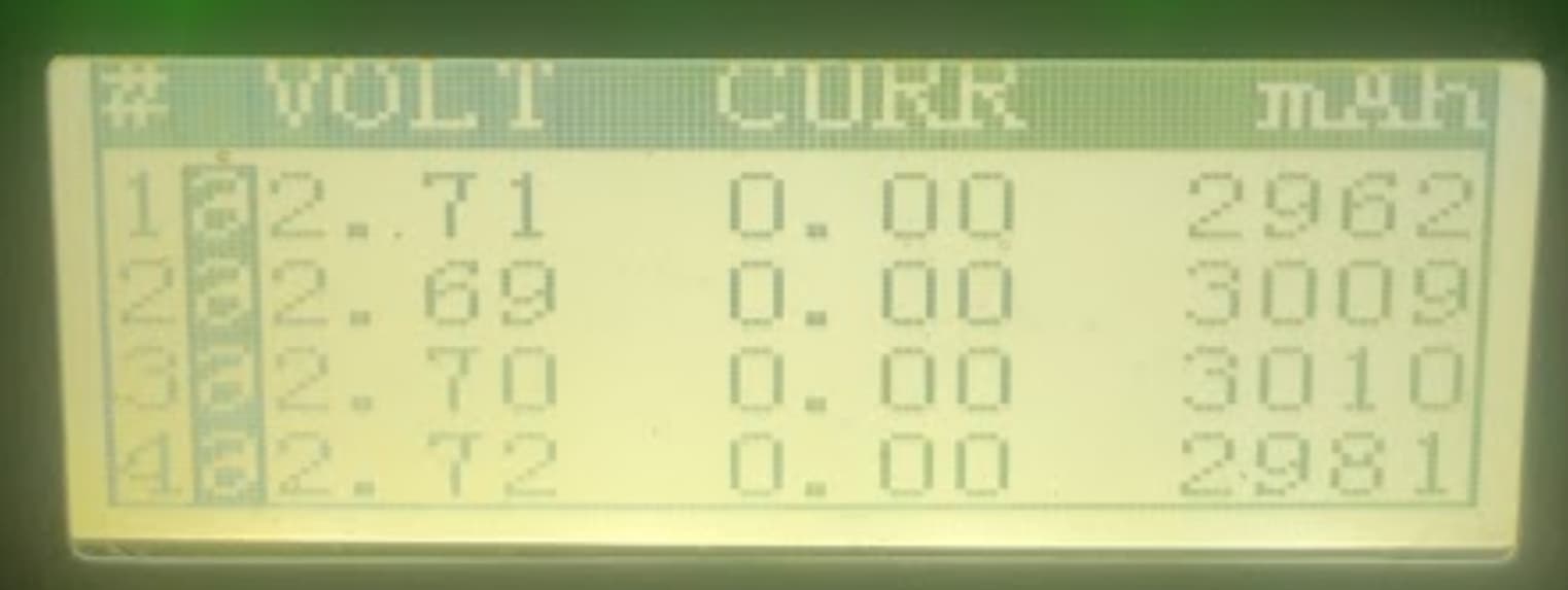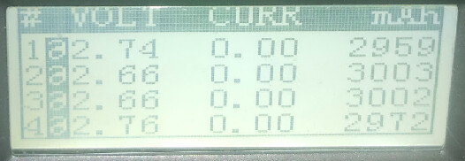 Charge-part of the cycle finished OK: the batteries received respectively 2288, 2333, 2329 and 2319 mAh. If we take these as the amount of charge they needed to reach their nominal 3000mAh capacity, then it would mean their initial SoC was between 22% and 24%… concerningly low IMO, specially given their temperature only rose from 20C to 25C, which would mean not too much energy was turned into heat during charging.