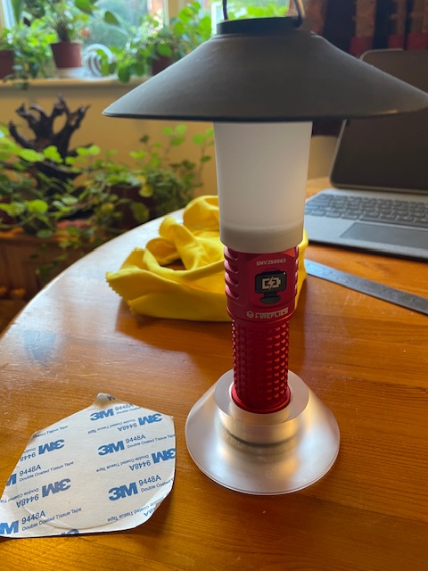 Got the base for this kit yesterday and the quality is way up there with the lantern. Really heavy hard acrylic base. I chose clear but there are blue and green GITD bases too. In the bottom is a serious magnet that hangs onto the removable ring magnet in the tailcap of the NOV-Mu. Also, a really nice touch is a rubbery adhesive sticker, so this could easily make a nice ceiling light (campervan, garden shed, cupboard etc).