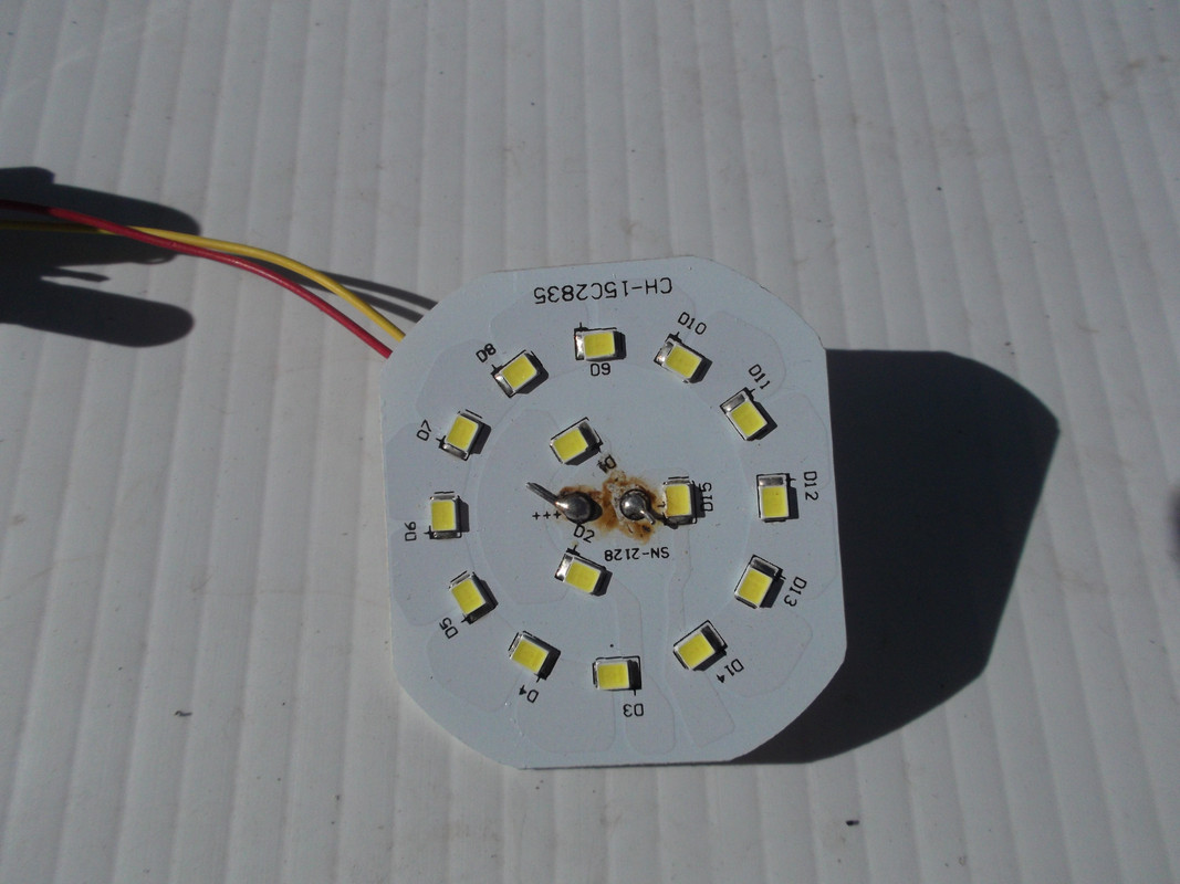 Here’s the circuit board and LED array for one of the cheap dollar store lights. I pulled this apart to show what makes the light work and why the A19 is the worst design for LED bulbs. This one has fifteen 2835 LEDs on the plate. They are the least efficient of the various LEDs (3528, 5050, 5630, 5730, 8520) used in strips. The AC/DC converter in the bulb consists of 4 diodes, two capacitors and two resistors (the load resistor is hidden on the bottom of the plate).