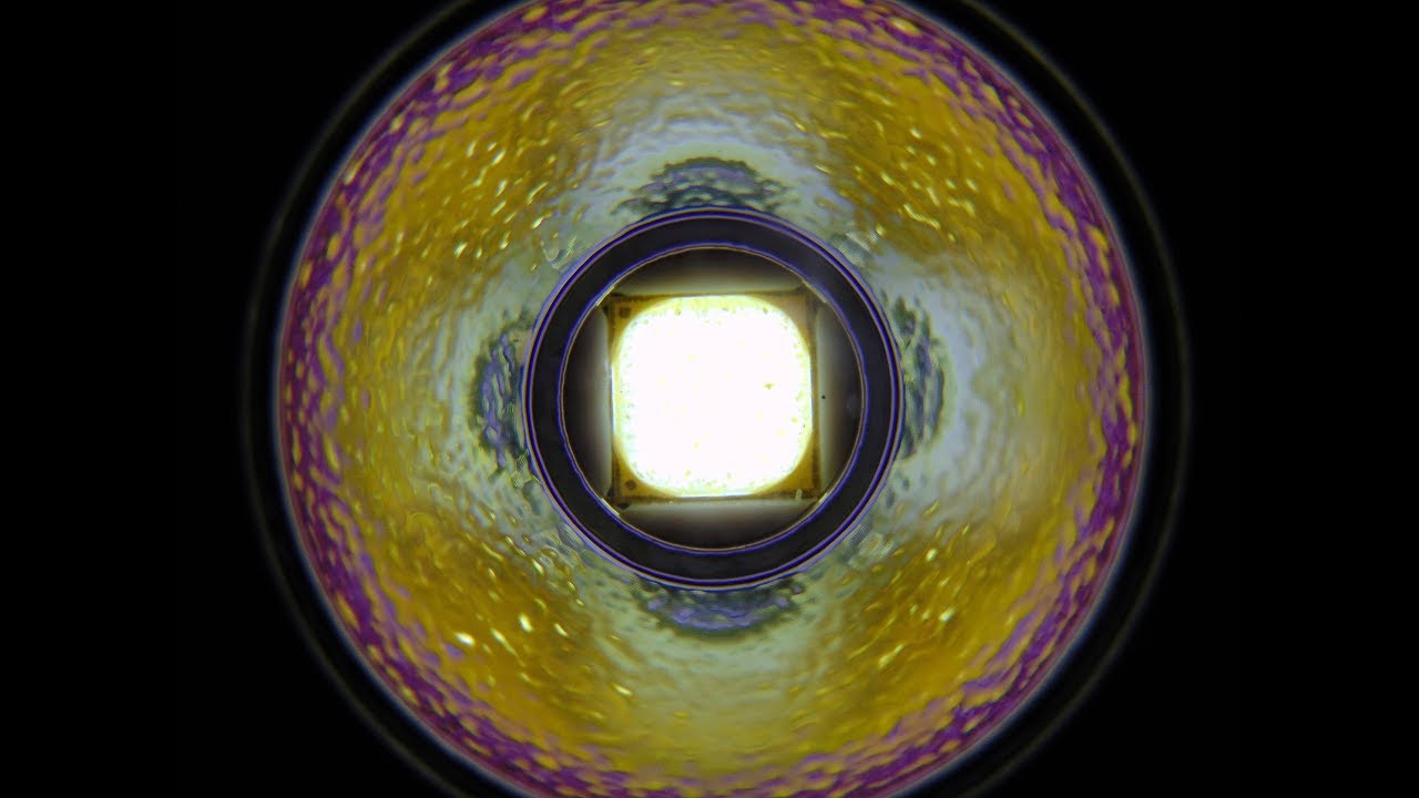 The LED is perfectly centered on my sample(s) in the Orange Peel reflector and those sit behind an AR coated lens. Shown here with the light OFF and also the LED with light turned on in Moon Mode.