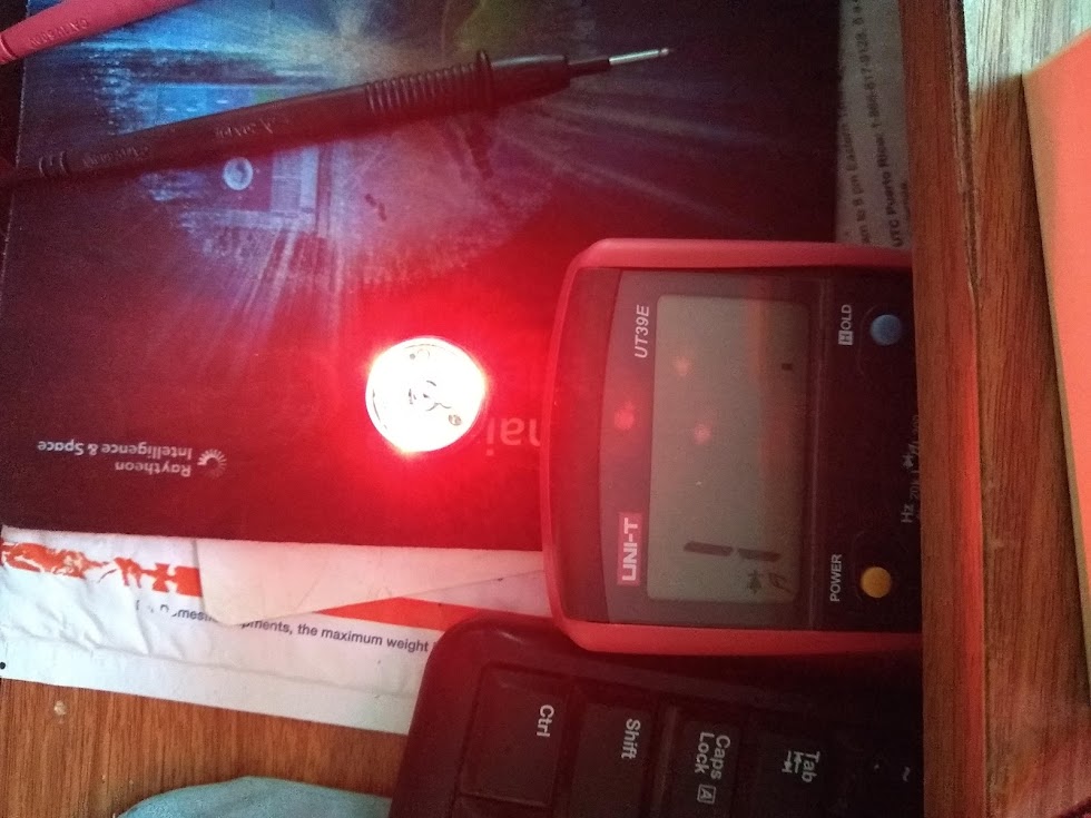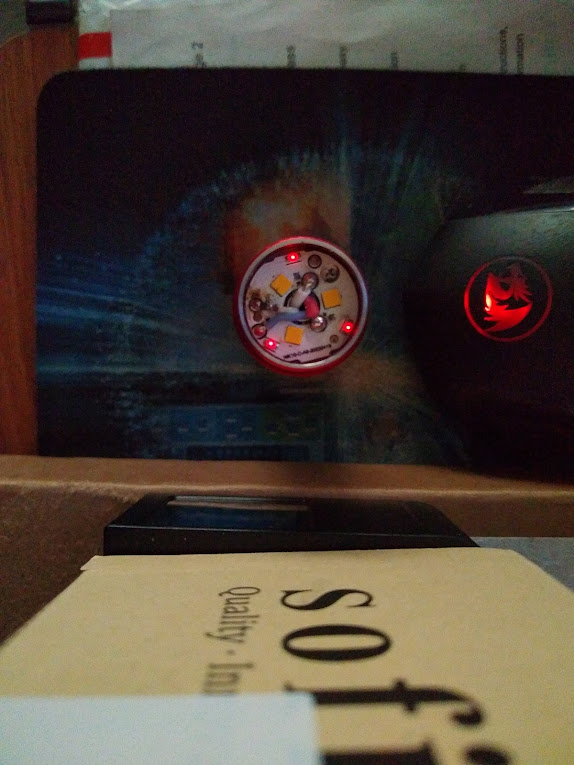 When I use a DVM in diode check mode, I see the aux diodes light up nicely, the DVM is applying 1.72V. It has been reported that with the aux LEDs on high, battery power is about 12mA. It was also reported the driver has a 100 ohms in series with the aux LEDs. What current would flow if there battery, resistor and Aux LEDs are in series? For a 3.7V battery, and say 1.7V across the aux LEDs, then there’s 2V across the resistor. That would be 20mA from the battery, so that’s not right, as there’s only 12mA. There must be only 1.2V across the 100 ohms. Perhaps there’s some sort of regulated output somewhere at 3V or so that drives this.