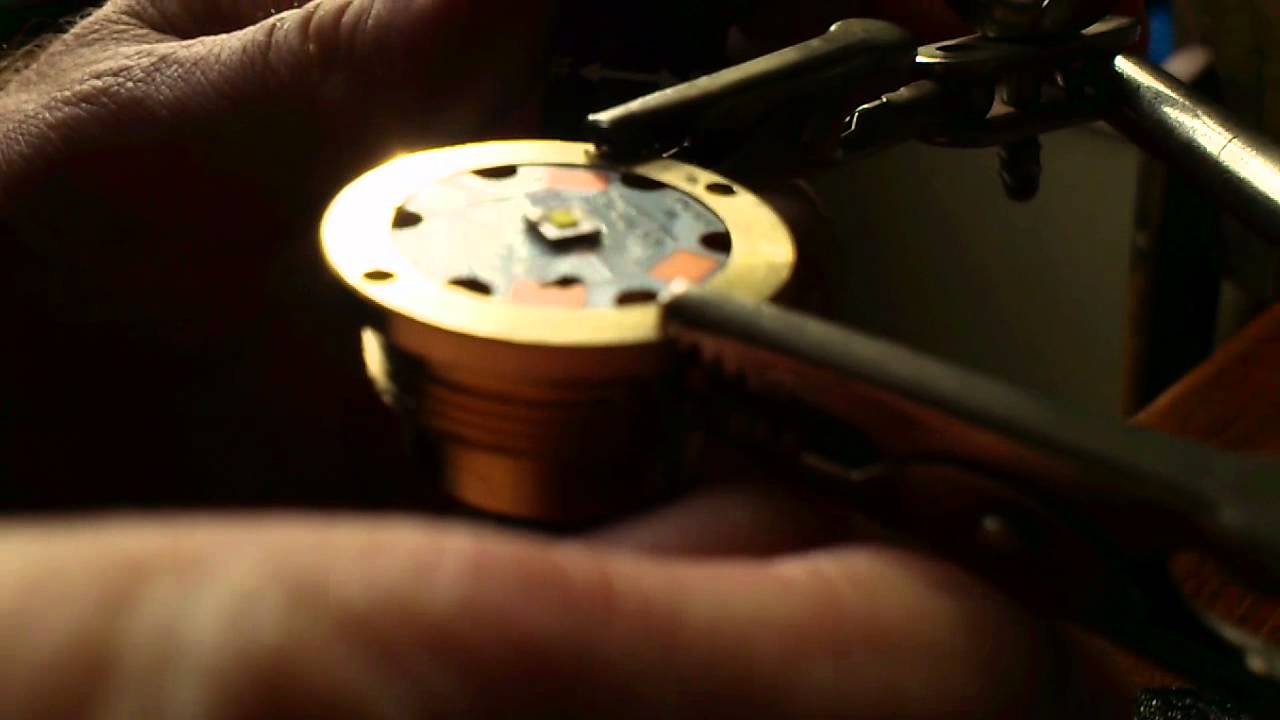 As you can see at 1.05 minute the solder paste melts and the board sinks in a bit. Unfortunately not really level, so after this video I heated the pil up once more and while still hot I pressed the board down on the pill with a forceps. I added a 3.05A Nanjg 105C driver, a blob of solder between driver and pill for electrical contact (brass pills are nice to work with!) and the flashlight was good to go: