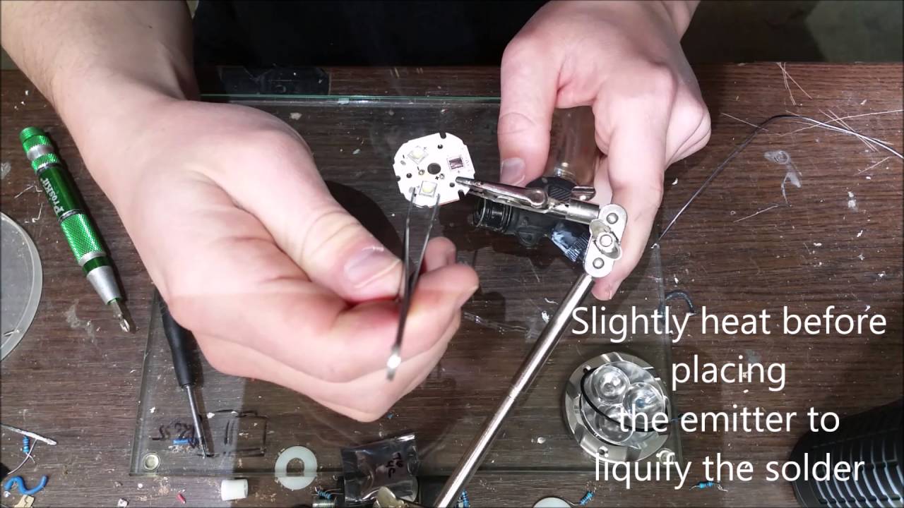 - I soldered a small copper disk to a short piece of wire passed through a small hole in the center of the emitter platform. This wire is then soldered to the positive battery terminal on the driver. When the light is assembled this wire is folded up under the driver.