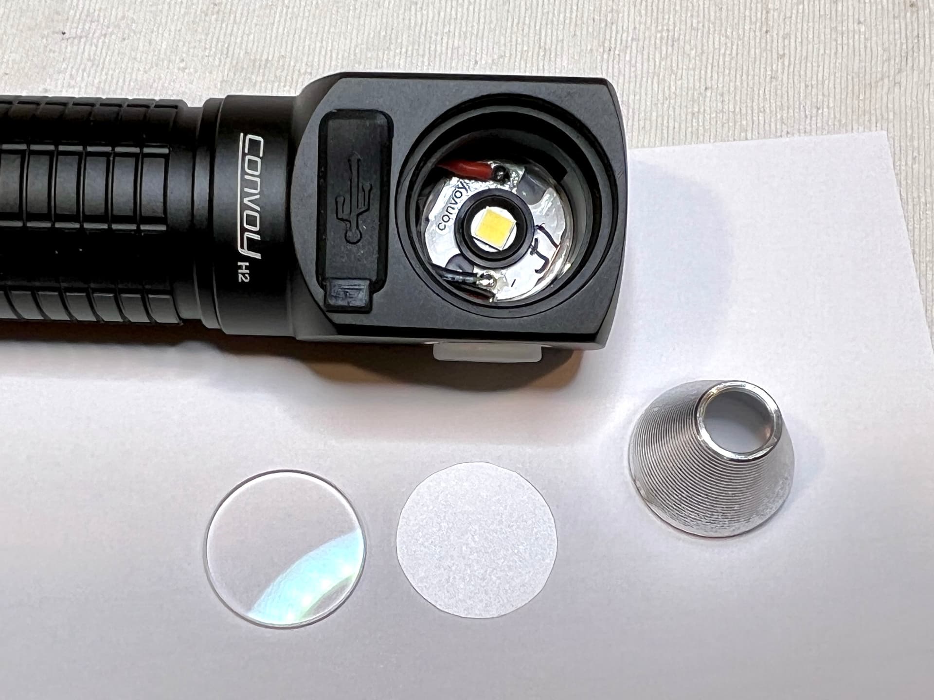 A simple, but very effective mod on an H2 that my adult son is getting for Christmas. It has a 5700K (his choice) B35AM LED and I was a little disappointed with the beam since it has a slight, but noticeable, donut hole and rings.
