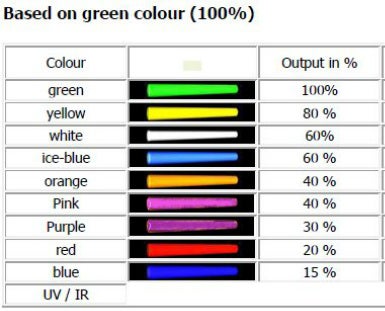 Glow in the dark brightness is similar to the tritium image above, green will always be brightest. Depending on website you look at, second brightest is yellow or “aqua” (blue-green).