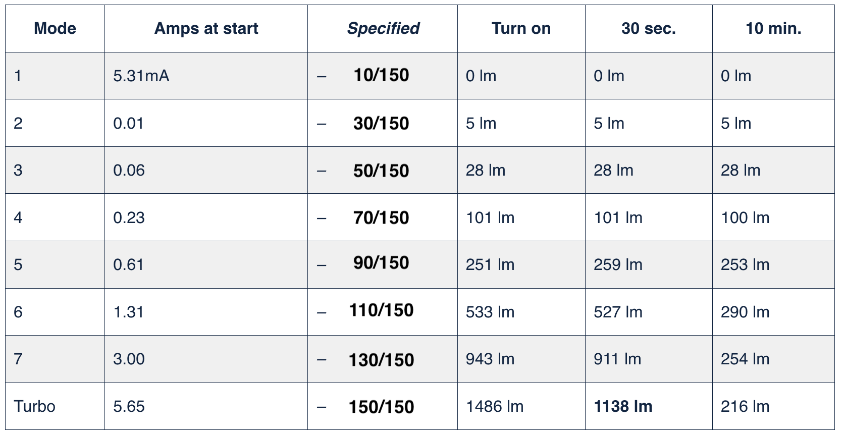 and as my nightstand light at very low (sublumen), on step 1, 0.01 to 0.05 lm