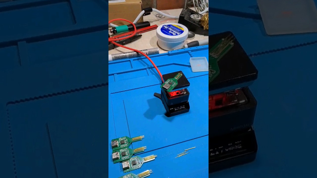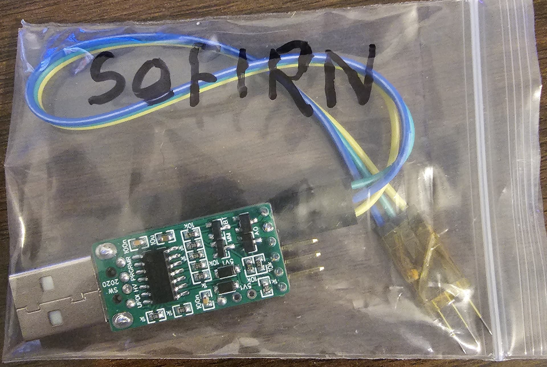 Now, get some dupont leads (e.g. Amazon.com ). Connect three to V+, V- and UPDI, then arrange the ends in the correct order (R = UPDI, V = V+, G = V-), and tape them together (I used kapton tape, but whatever you have to hand like masking tape or sellotape will work too).